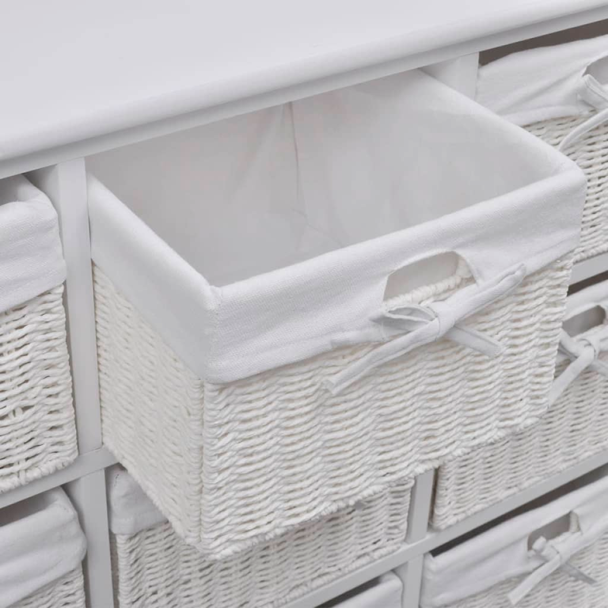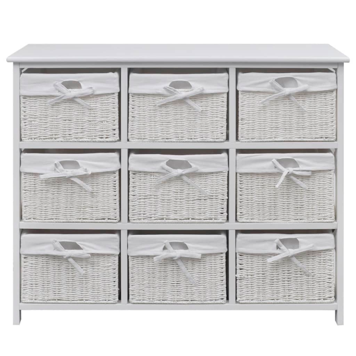 This stunning cabinet, made of high-quality material, features a simple but stylish design. It will not only keep your belongings neatly organised but will also enhance your room decor. This storage unit has 9 woven baskets, and each basket has a washable fabric liner. This piece of furniture has white paint finish that makes it durable and easy to clean. This beautiful, versatile cabinet presents a perfect storage solution for any room in your home.