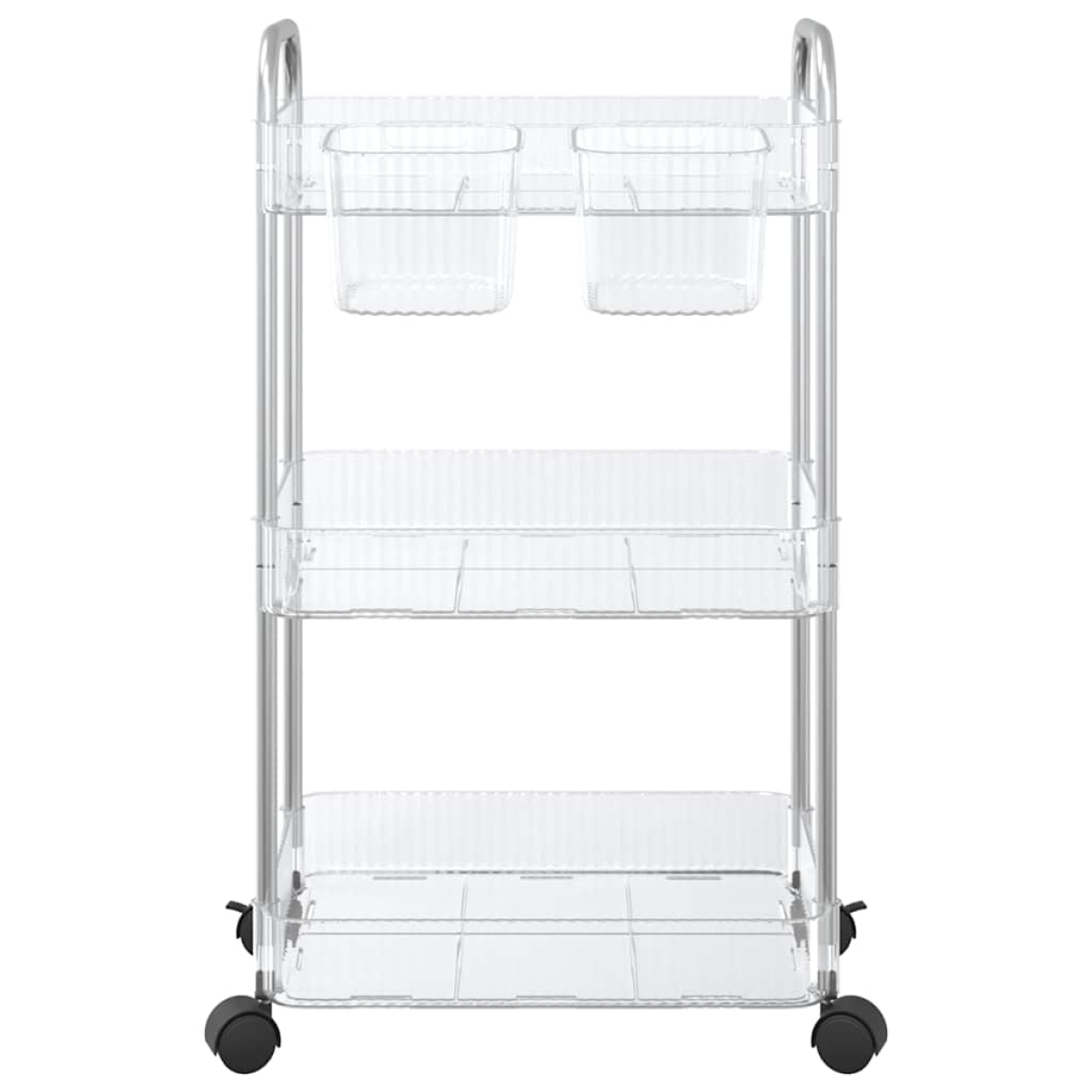 This storage trolley offers an ideal solution for organising various spaces including your kitchen, living room, bathroom, laundry room and office.Lightweight and durable: Made from robust acrylic baskets and a stainless-steel frame, this storage cart is lightweight, stable and durable.Versatile use: This storage cart is versatile and can be used in various settings, such as the kitchen, living room, bathroom and office. It can help keep things like food, books, toiletries and office supplies neatly stored and easily accessible.Extra storage: This utility cart has two extra hanging cups for storing small items like knives, forks, chewing gum, keys, and more, optimising space utilisation.Easy movement and safe parking: This storage trolley is equipped with four casters, two of which have brakes, allowing you to effortlessly relocate it to any desired spot and securely lock it in place for added control and safety.Convenient handles: This storage trolley is designed with two handles on the top, making it easy for you to push and pull for convenient mobility.