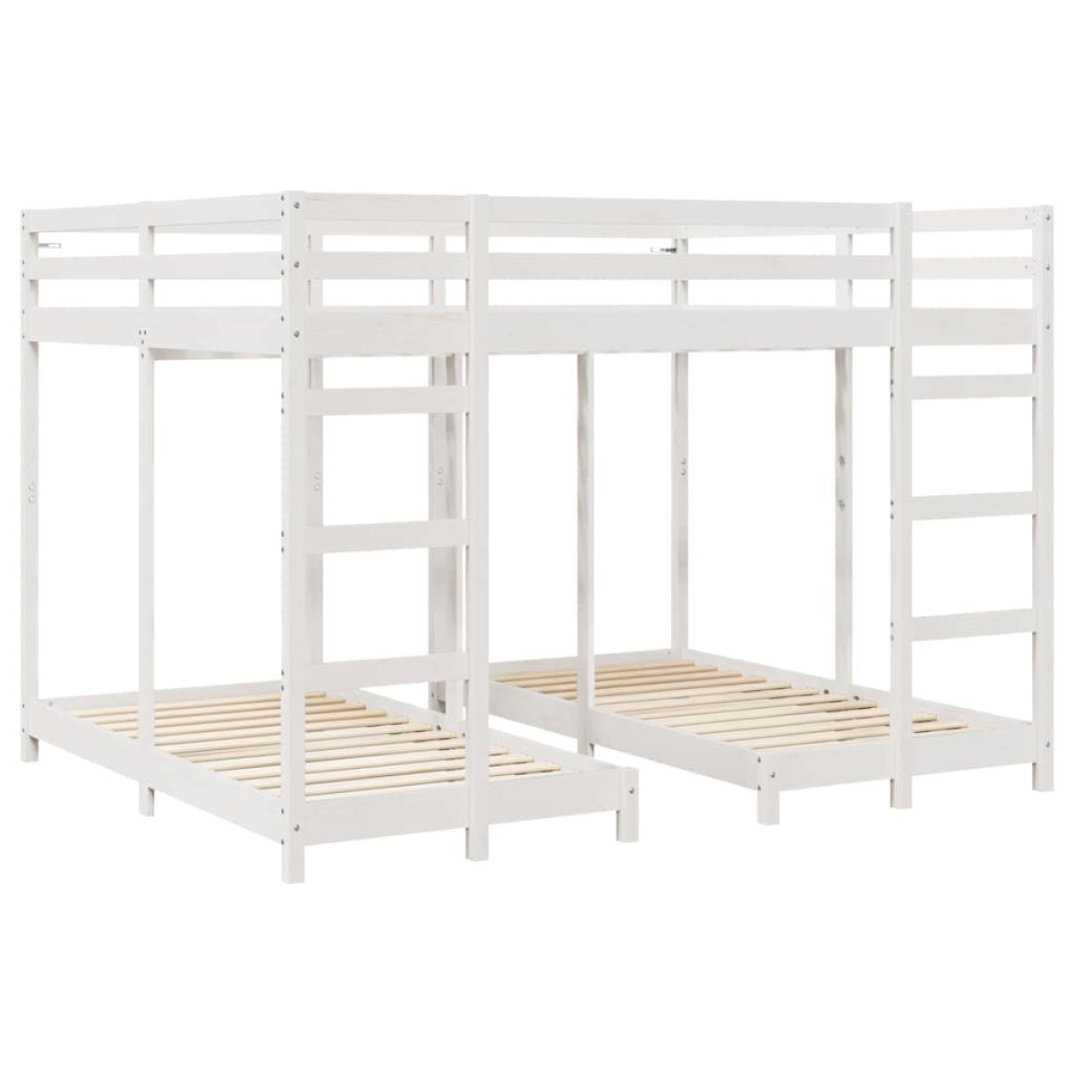 This Triple Bunk Bed Frame introduces a functional and stylish solution for shared bedrooms, combining space-saving ingenuity and modern design. Constructed from resilient solid pine wood, this versatile furniture piece fits perfectly in indoor settings, making it suitable for children's rooms, guest accommodations, or compact living areas. Its robust structure elegantly showcases a wooden texture that complements various interior styles and offers families a practical way to optimize space without sacrificing aesthetics. Material Quality: Crafted from solid pine wood, this triple bunk bed boasts a sturdy structure that enhances durability and stability. The natural grain of the wood adds warmth and character to any bedroom interior, offering an aesthetically pleasing yet functional accommodation solution. Included Components: Equipped with two ladders and sturdy guardrails, the bunk bed ensures secure and easy access to the topmost bunk, providing peace of mind for safety-conscious households. Each component is thoughtfully designed to improve accessibility and child safety, underscoring its family-friendly appeal. Space-saving Efficiency: The triple bunk design is an inventive space-saving solution, perfect for compact living spaces or shared bedrooms. This configuration maximizes vertical space, enabling more room for play, storage, or additional furniture in the room. Recommended Uses: Ideal for children’s rooms, guest rooms, or cabins, the bed's functional design fits effortlessly into studios or urban apartments. It's a practical choice for anyone needing flexible sleeping arrangements in confined spaces, thereby adding convenience and value. Assembly and Maintenance: Requires assembly by two individuals using a screwdriver. Regular dusting and minimal care preserve the wood's natural appearance, ensuring continued longevity and appeal with proper maintenance.