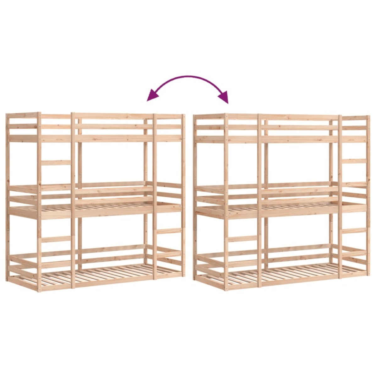 This wooden triple bunk bed is elegant and functional, making it a perfect addition to any room with limited space. Robust and stable: Solid pinewood is known for its strength and durability. Its straight grains and distinctive knots contribute to its rustic charm.Safety guardrails: The triple sleeper comes with safety guardrails on all 4 sides, so you can sleep without worrying about falling off.Practical ladder: The ladder of this bunk bed makes sleeping on the upper floor easier and safer and offers you sufficient safety and stability.Full use of space: This triple sleeper bunk bed uses vertical space efficiently and can be easily converted into separate single and platform beds. Perfect for multi-headed families or spontaneous overnight guests, this triple bed meets versatile sleeping needs. Good to know:The delivery includes bed frames only. The mattresses are not included. You can check our shop for matching mattresses.Screws and plugs for inside the wall are not included. We advise to find and use screws and plugs suitable specifically for your walls. If you're not sure, you can consult with a professional. Please read and follow each step of the instructions.