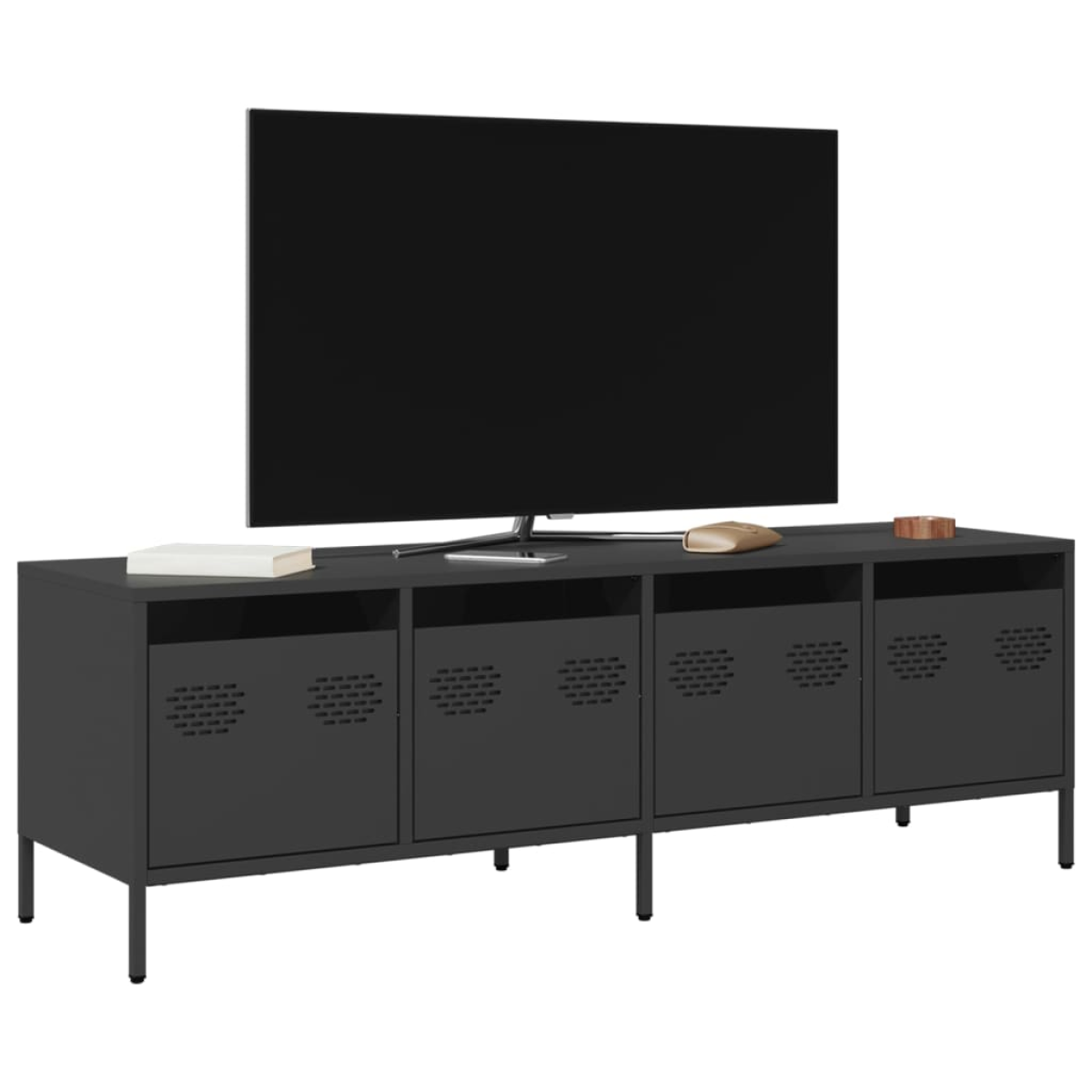 This sturdy TV cabinet with an industrial style makes a timeless addition to your living room or bedroom. Stable material: The TV stand's frame is made of cold-rolled steel. Cold-rolled steel is a kind of low-carbon steel produced by a "cold rolling" method and processed at near-normal room temperatures. Cold-rolled steel has a smoother surface, greater strength, and higher precision.Ample storage space: The cabinet with 4 drawers offers ample storage space for keeping your various daily essentials well organised and within easy reach.Adjustable screw feet: This TV sideboard is equipped with four adjustable screw feet to compensate for uneven floors, ensuring stability and balance.Easy to clean: The metal cabinet is easy to clean with a damp cloth and requires less maintenance.
