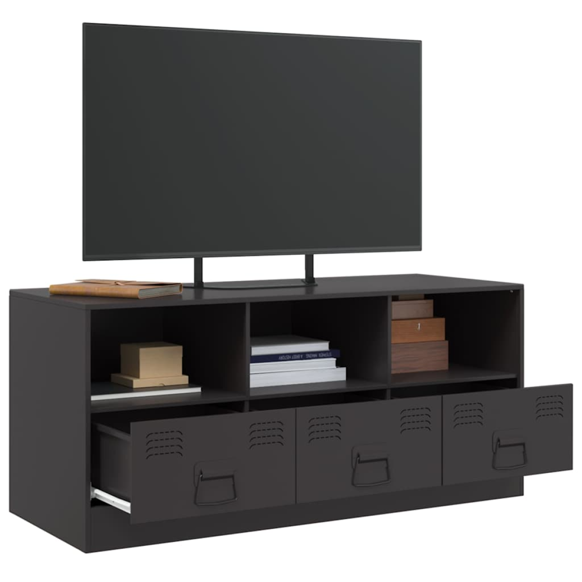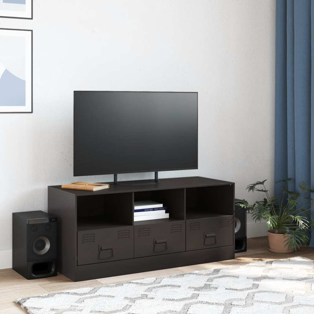 This sturdy TV cabinet is designed to be a focal point of your room with a trendy yet practical design. Stable material: The TV cabinet's frame is made of cold-rolled steel. Cold-rolled steel is a kind of low-carbon steel produced by a "cold rolling" method and processed at near normal room temperatures. Cold-rolled steel has a smoother surface, greater strength, and higher precision.Ample storage space: This cabinet offers handy storage space for keeping your magazines, books, remote controls and other small items well-organised and within reach.Easy to maintain: The table is easy to clean with a damp cloth and requires less maintenance.Practical handle: The TV cabinet comes with 3 handles that make it easy to open and close the cabinet while also adding to extra beauty.