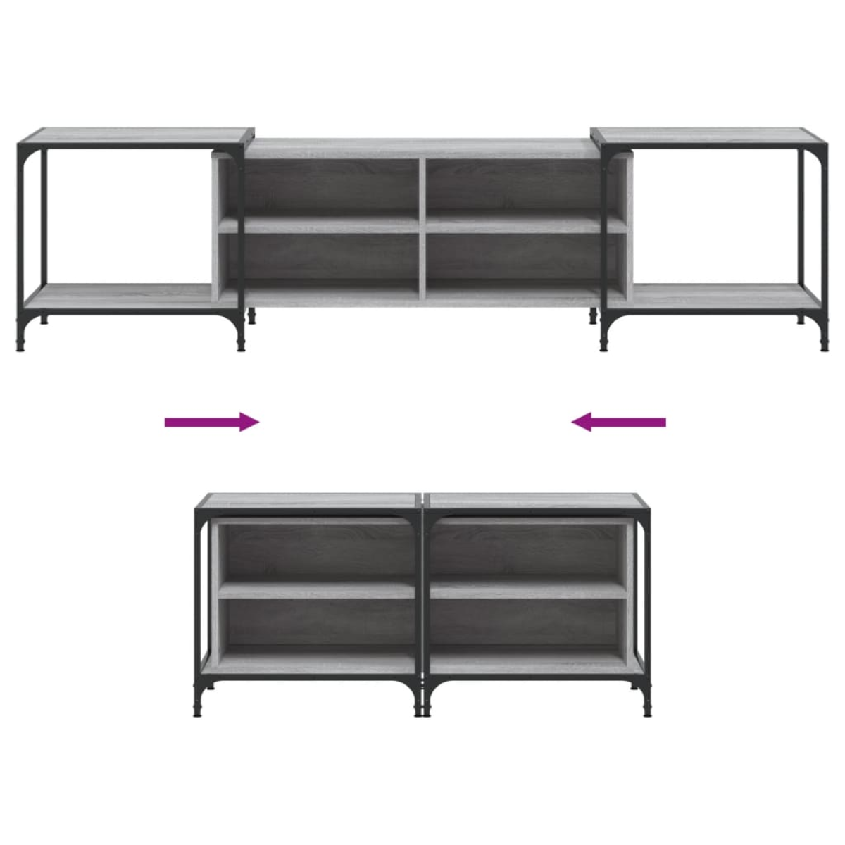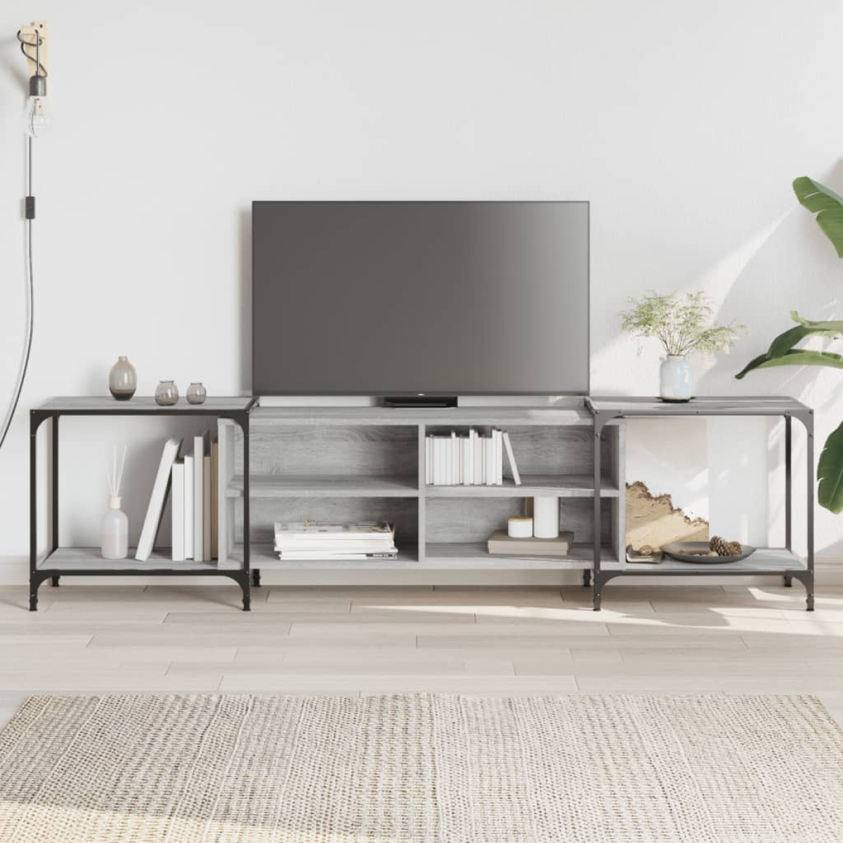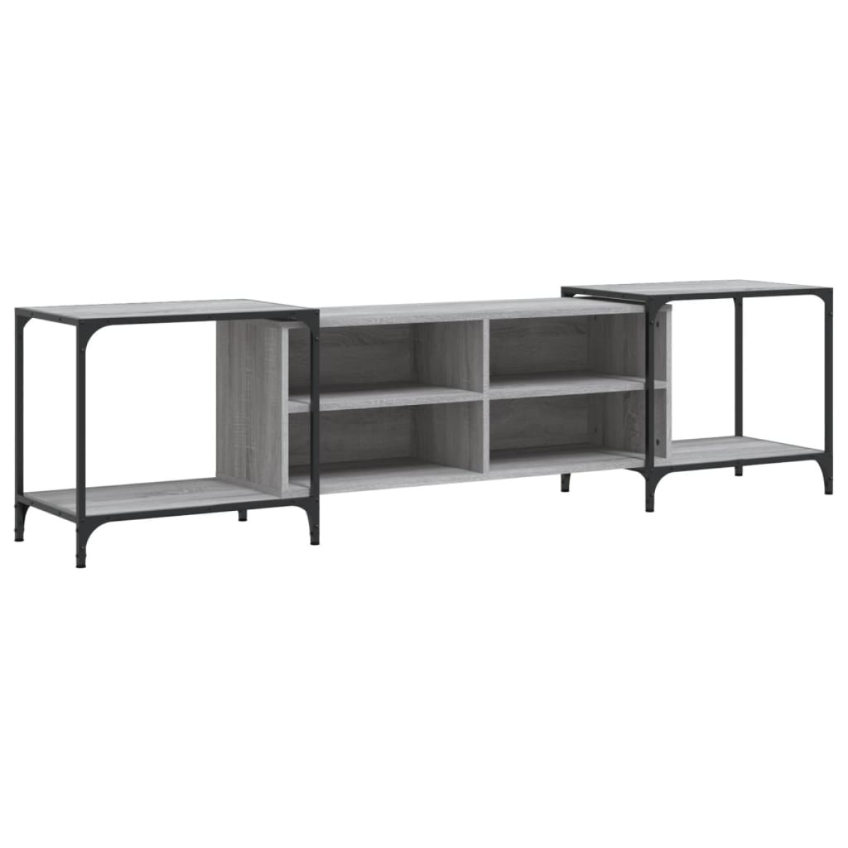 This trendy TV cabinet, featuring a sleek and stylish design, is meant to be a decorative as well as practical addition to your room decor. Durable material: The engineered wood is of exceptional quality with smooth surface and also features strength, stability and resistance to moisture. Made of engineered wood, the TV stand is easy to clean.Ample storage space: The TV unit with shelves offers sufficient storage space to keep your essentials well organised and within reach.Adjustable design: The TV console is adjustable in width as per your needs. Also, the adjustable feet with plastic pads keep the media cabinet balanced on uneven ground and increase stability.Displaying function: The sturdy top of this TV sideboard is a perfect spot for displaying potted plants, framed photos and other decorative items.Metal frame: The metal frame adds an industrial style to your interior while ensuring durability and stability. Warning:To prevent it being overturned, this product must be used with the provided wall attachment device.