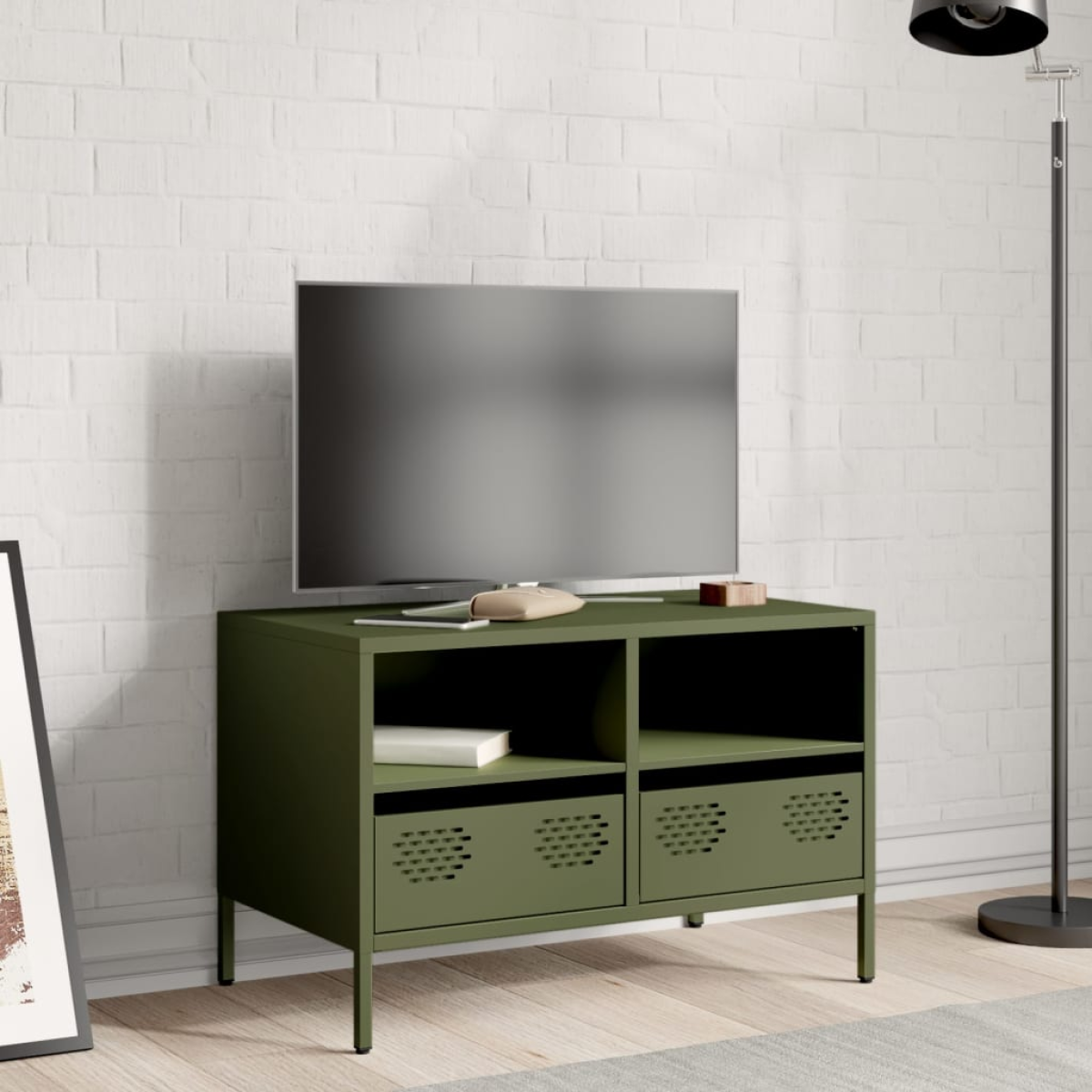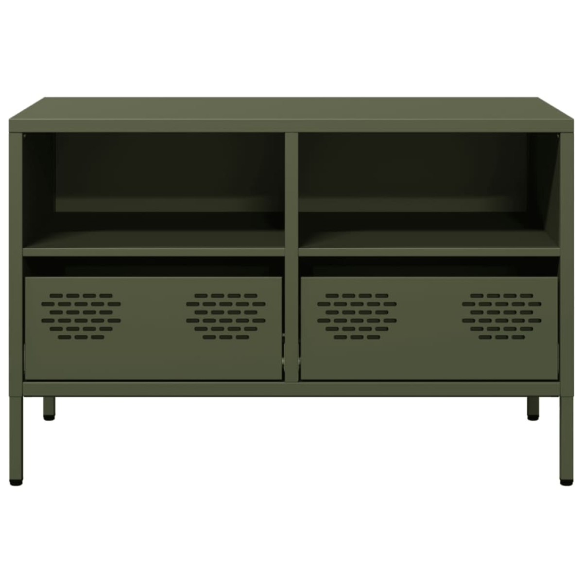 This sturdy TV cabinet with an industrial style makes a timeless addition to your living room or bedroom. Stable material: The TV stand's frame is made of cold-rolled steel. Cold-rolled steel is a kind of low-carbon steel produced by a "cold rolling" method and processed at near-normal room temperatures. Cold-rolled steel has a smoother surface, greater strength, and higher precision.Ample storage space: The cabinet with 2 compartments and 2 drawers offers ample storage space for keeping your various daily essentials well organised and within easy reach.Adjustable screw feet: This TV sideboard is equipped with four adjustable screw feet to compensate for uneven floors, ensuring stability and balance.Easy to clean: The metal cabinet is easy to clean with a damp cloth and requires less maintenance.