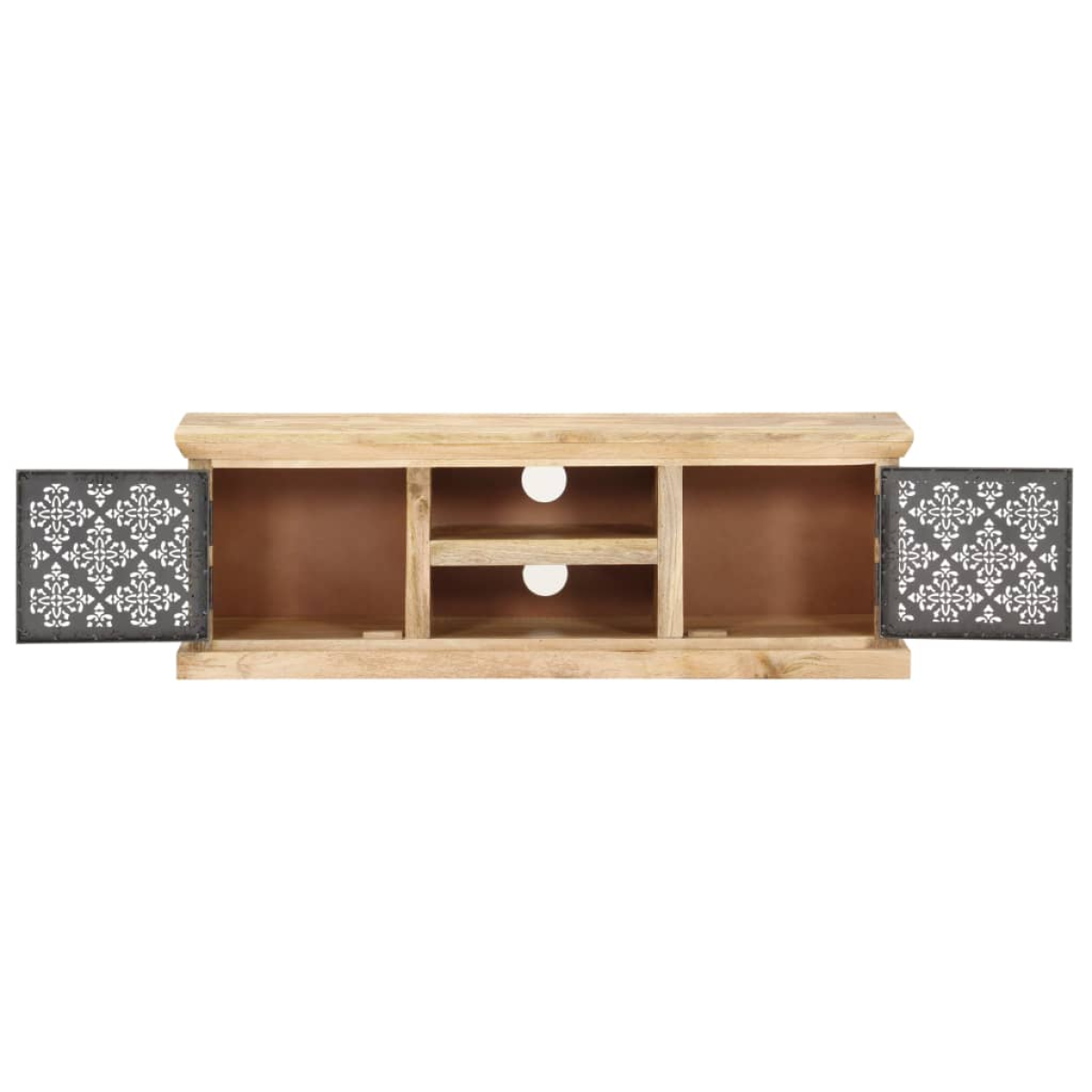 Do you want both a TV stand and a media console storage cabinet? Our TV cabinet is designed to meet your needs. This media table, made of solid mango wood, is given a beautiful finish by polishing, painting and lacquering, making it exude a refined look. The steel doors with a hollow design add to the cabinet’s beauty. This TV stand includes 2 open shelves and 2 doors for storing your electronics, gaming accessories, books and other items. It is easy to clean with a damp cloth.