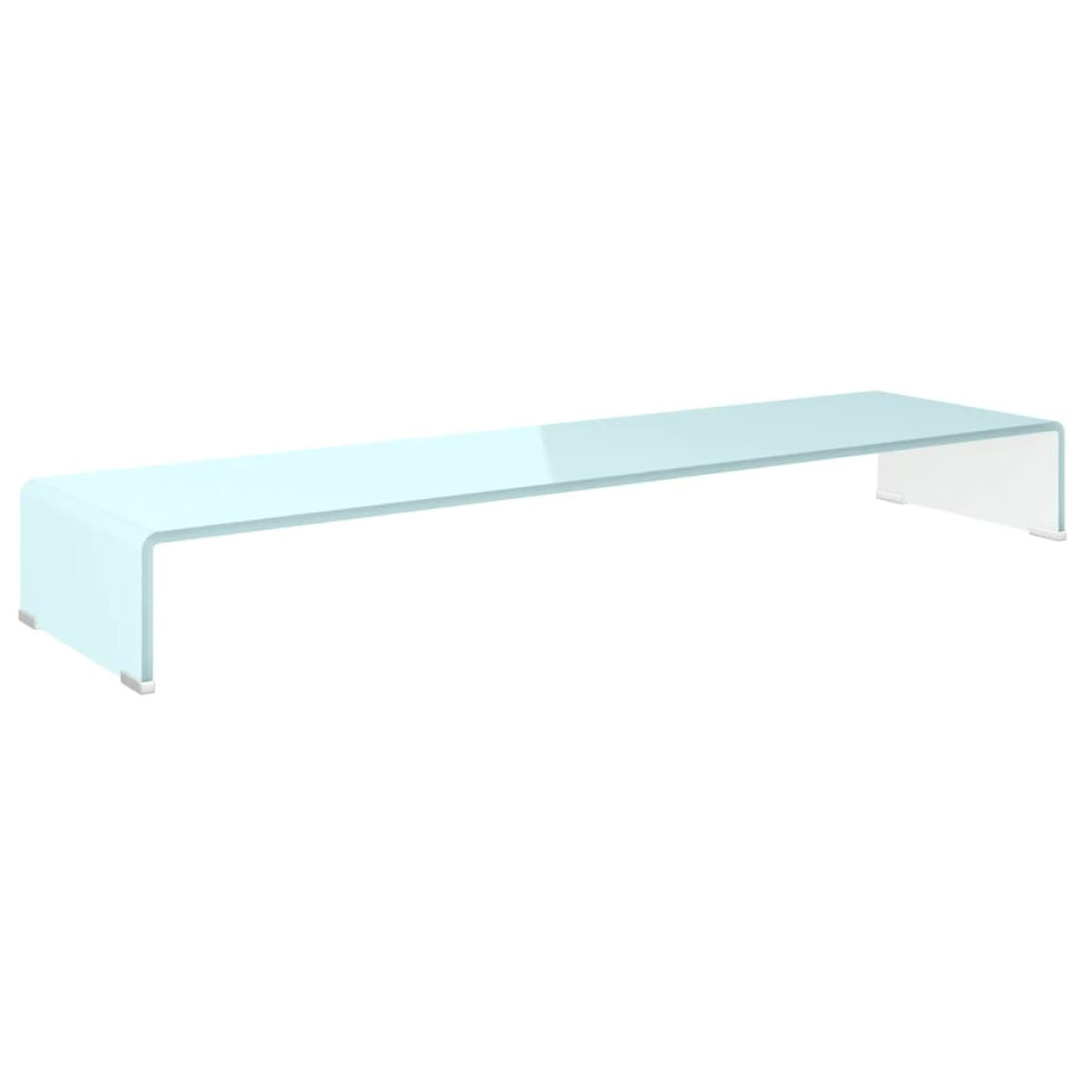 This practical TV stand has a tempered glass construction. The sleek, streamlined design of this understated TV unit will add a modern touch to your living space. This glass shelf can be used as a TV stand or riser for your desktop monitor, television, laptop and other multimedia devices. With the glass shelf raising the monitor, you will have a better view of the screen while sitting comfortably, which helps to reduce the strain and discomfort on your neck or back. The space underneath can accommodate your DVD player, game console, streaming device, receivers, and media carriers. The glass frame is tempered for added strength and safety. The smooth surface is easy to clean with only a damp cloth.