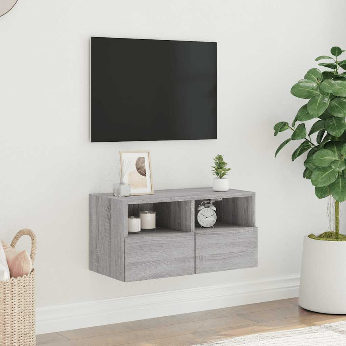 This TV wall cabinet is the perfect solution for your living space to maximise space and keep the floor areas uncluttered. Durable material: The engineered wood is of exceptional quality with a smooth surface and also features strength, stability and resistance to moisture.Ample storage space: The floating TV unit has 2 shelves and 2 compartments behind the door to keep your small items like books, DVDs, and magazines neatly organized and within reach.Wall-mounted design: This wall media unit can be wall-mounted to add extra storage space. That way, you can maximise your floor space and keep the area clean. Good to know:Screws and plugs for inside the wall are not included. We advise to find and use screws and plugs suitable specifically for your walls. If you're not sure, you can consult with a professional. Please read and follow each step of the instructions.