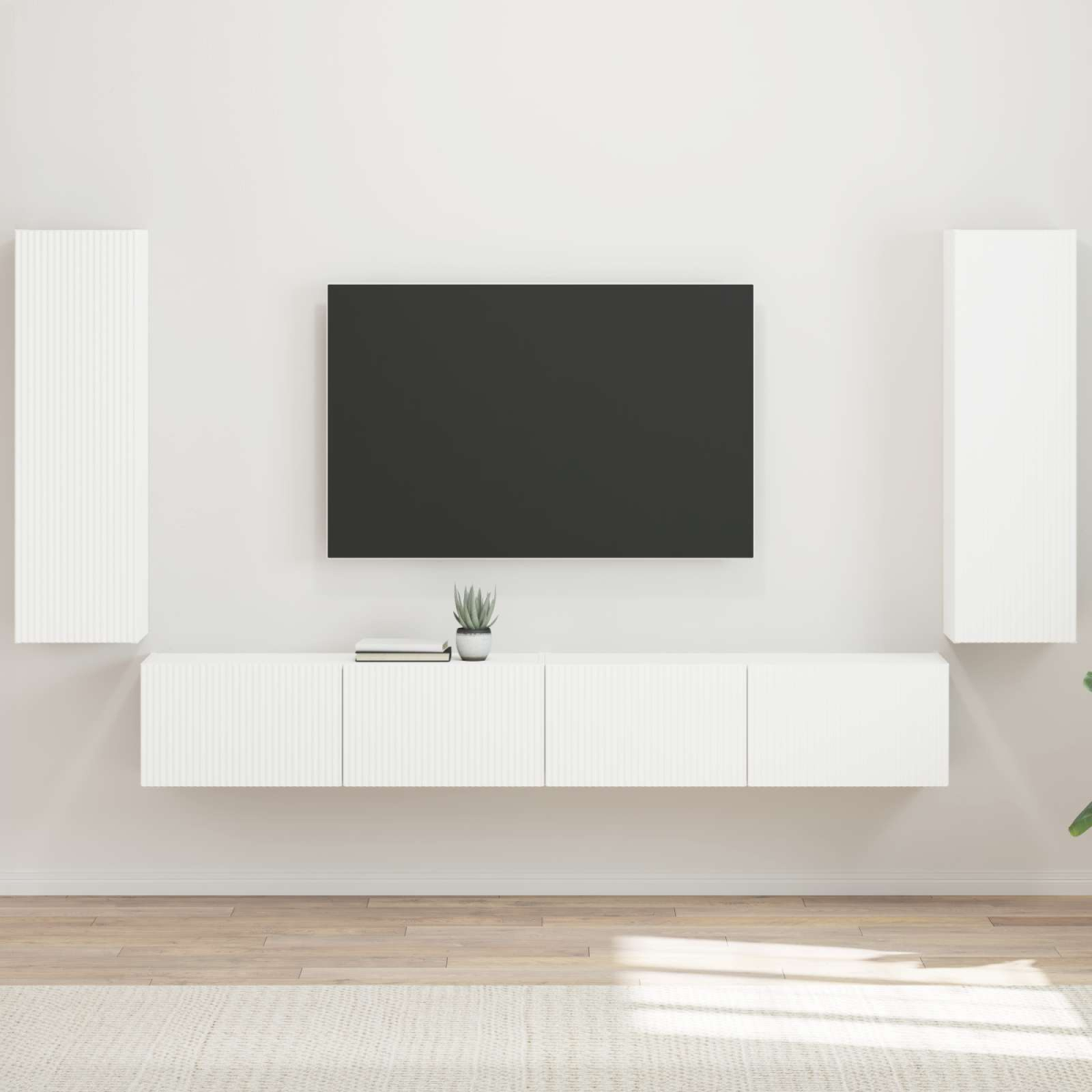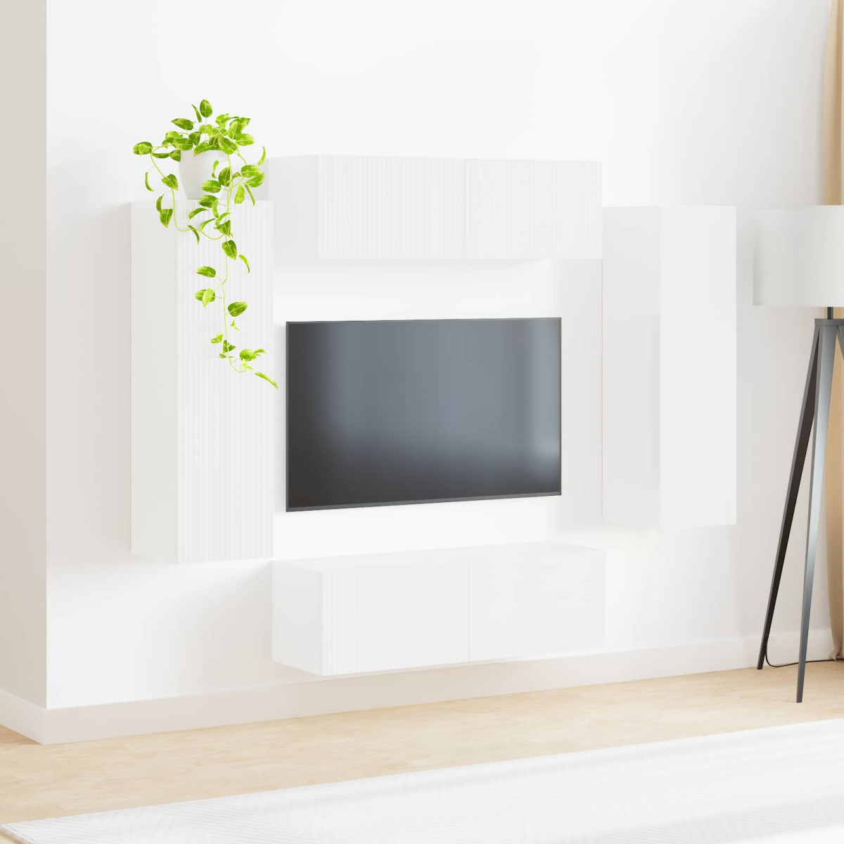 This TV Wall Cabinet Set transforms your living room into a modern entertainment hub, combining functionality with aesthetics. Its sleek rectangular shape and wall-mounted design not only save space but also add a sophisticated touch to any room. Perfect for organizing your media accessories, it creates a neat and clutter-free environment, enhancing your viewing experience. With a stylish mix of engineered wood, this set blends seamlessly into contemporary interiors, effortlessly becoming a focal point of your decor setup. Modern Wall-Mounted Design The TV Wall Cabinet Set embraces a modern aesthetic with its wall-mounted design, perfect for maximizing your living space and adding a clean, streamlined look. This sleekly designed set effortlessly complements modern homes, combining functionality with style, ensuring it becomes the centerpiece of your room. Durability and Quality Built from engineered wood, this cabinet set ensures lasting durability and sturdiness. Ideal for frequent use, the engineered wood resists daily wear and tear, maintaining its fresh look and performance for years to come. The robust construction offers a reliable framework for securely holding your entertainment equipment. Ample Storage Options Featuring 90° swing hinge doors, this set offers various compartments designed to house your electronics and accessories in an organized manner. It holds your belongings discreetly, providing a clean look, and is perfect for those who prioritize tidy environments without compromising on accessibility and usability. Easy Maintenance Care for this modern set is hassle-free as it only requires a quick wipe with a damp cloth to keep its pristine appearance. This simple maintenance routine ensures that the cabinet remains a stylish piece, offering practicality by simplifying your cleaning routine without extra effort. Perfect Fits for Living Rooms Designed for indoor use, this well-curated set is ideal for enjoying your favorite shows and movies in comfort from your living room. This cabinet enhances your viewing experience, providing a stylish frame to your television while maintaining the room's aesthetics and functionality.