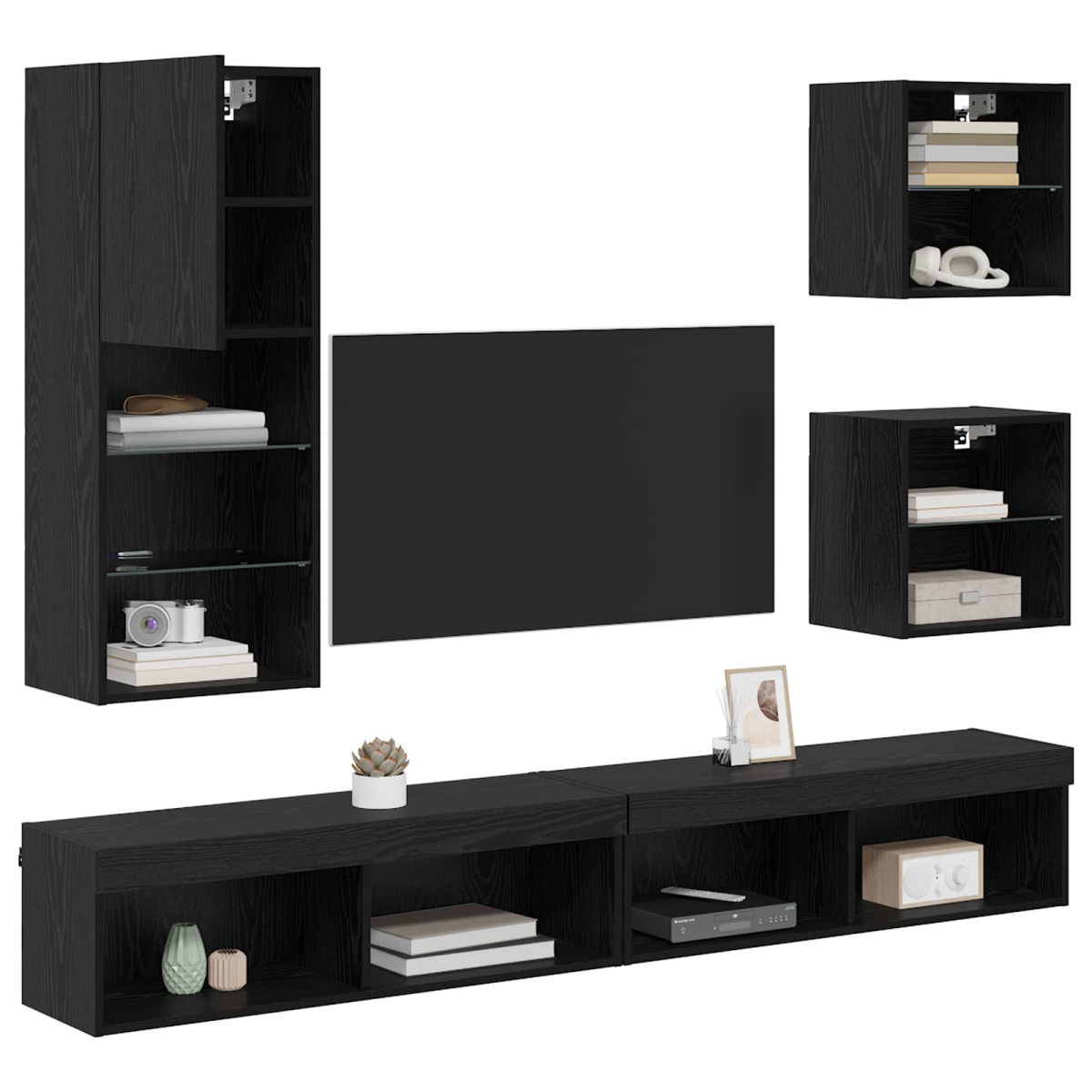 The Modern TV Wall Units with LED are a perfect solution for those looking to combine style and functionality in their living room. This wall-mounted cabinet set enhances the aesthetic appeal with its sleek, rectangular shape, making it ideal for contemporary home décor. Designed for indoor use, this unit not only provides a modern touch but also serves as a practical space-saving solution by utilizing wall space efficiently. Materials: Built with engineered wood, this unit boasts abrasion resistance, ensuring durability over time. The combination of glass and wood materials adds to its elegant appeal and complements various interiors, offering both aesthetics and reliability to your living space. Included Components: Features multiple glass and board shelves for displaying items, along with hinged doors crafted from engineered wood for secure storage. The LED strip lights add ambient illumination, showcasing your décor in an elegant light. No detail is overlooked to improve functionality. Features /Function /Design: Designed with storage in mind, it incorporates compartments that are perfect for storing various items, helping you maintain a clutter-free space. The wall-mounted design provides a streamlined appearance while maximizing room space. Recommended Uses: Suitable for living rooms, this cabinet system fits effortlessly within modern, minimalist, or even traditional setups. It’s adaptable for various decorative uses including displaying art pieces or storing media equipment. Care &Maintenance: To preserve its sleek appearance, dust with a dry cloth regularly. Avoid harsh chemicals to maintain wood and glass finishes. Ensures long-term performance with minimal upkeep.