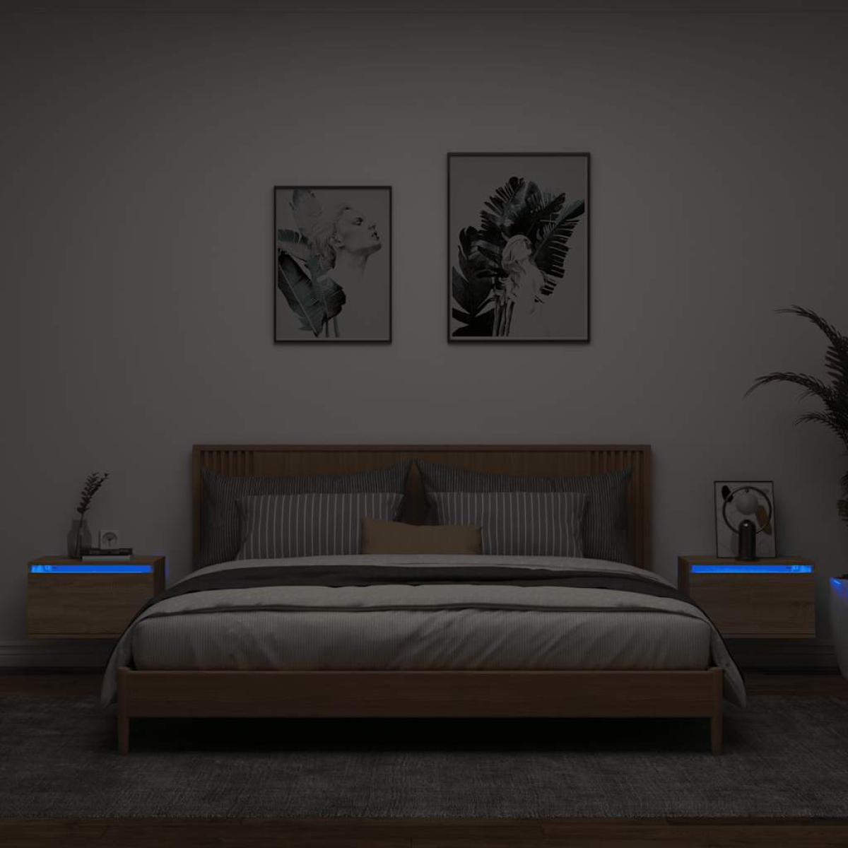 These wall-mounted bedside cabinets with LED lights are the perfect solution for your living space to maximise space and keep the floor areas clean. Durable material: The engineered wood is of exceptional quality with smooth surface and also features strength, stability and resistance to moisture. Made of engineered wood, the wall hung bedside cabinet is easy-to-clean.RGB LED lights: The floating bedside cabinet is equipped with vibrant RGB LED lights. With various customisable menus, you can effortlessly change the colour of the lights and even set them to adjust automatically. These LED lights not only enhance the contemporary look of the cabinet but also add to its trendy appeal.Wall-mounted design: This floating bedside unit can be wall-mounted to add extra storage space. That way, you can maximise your floor space and keep the area clean.Multifunctional cabinet: The bedside wall cabinet serves as the ideal place to put items such as books, collectables, ornaments, and more. It transforms an empty wall into a design feature. Good to know:Screws and plugs for inside the wall are not included. We advise to find and use screws and plugs suitable specifically for your walls. If you're not sure, you can consult with a professional. Please read and follow each step of the instructions.The product has a USB connector that requires a certified 5V USB power source (not included).