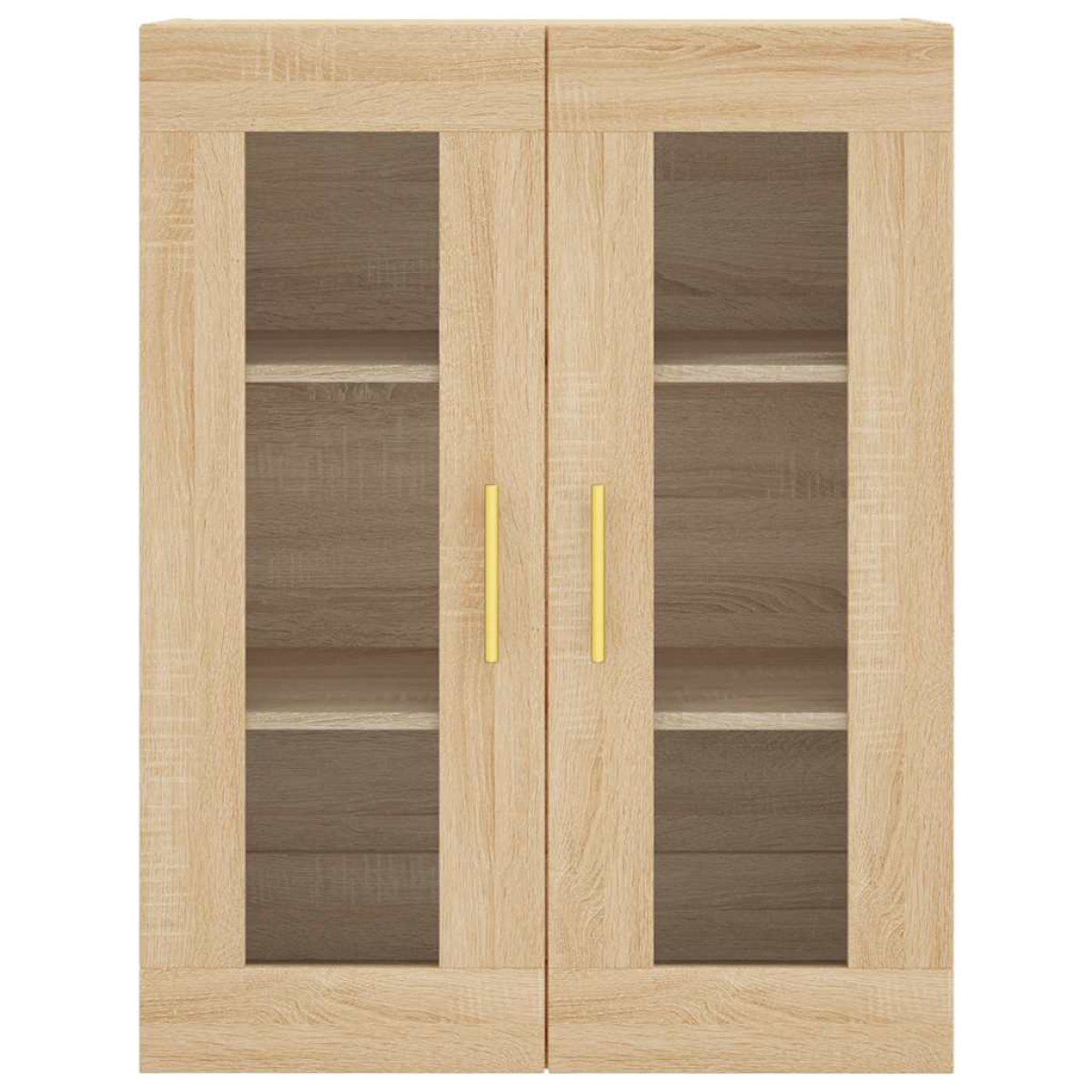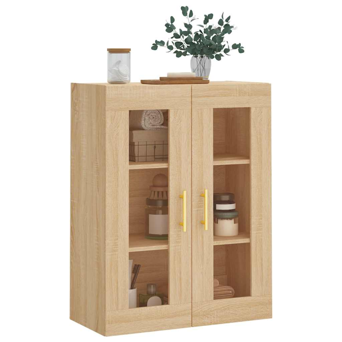 This wall mounted cabinet with an elegant design makes a timeless addition to your interior decor. Durable material: The engineered wood is of exceptional quality with smooth surface and also features strength, stability and resistance to moisture. Made of engineered wood, this storage cabinet is sturdy and durable. Ample storage space: The hanging cabinet offers ample storage space for keeping your various daily essentials well organised and within easy reach.Wall-mounted function: The hanging wall cabinet doesn't take any floor space. You can hang it on the wall easily.Practical design: Your belongings are visible behind the glass door and at the same time protected from dust. In addition, the handles make it easy to open the side cabinet.Versatile cabinet: You can also put this floating storage cabinet on top of a sideboard to form a highboard, creating extra storage space. And the simple design makes it suitable for your living room, bedroom, study, and any other living space. Good to know:Screws and plugs for inside the wall are not included. We advise to find and use screws and plugs suitable specifically for your walls. If you're not sure, you can consult with a professional. Please read and follow each step of the instructions.