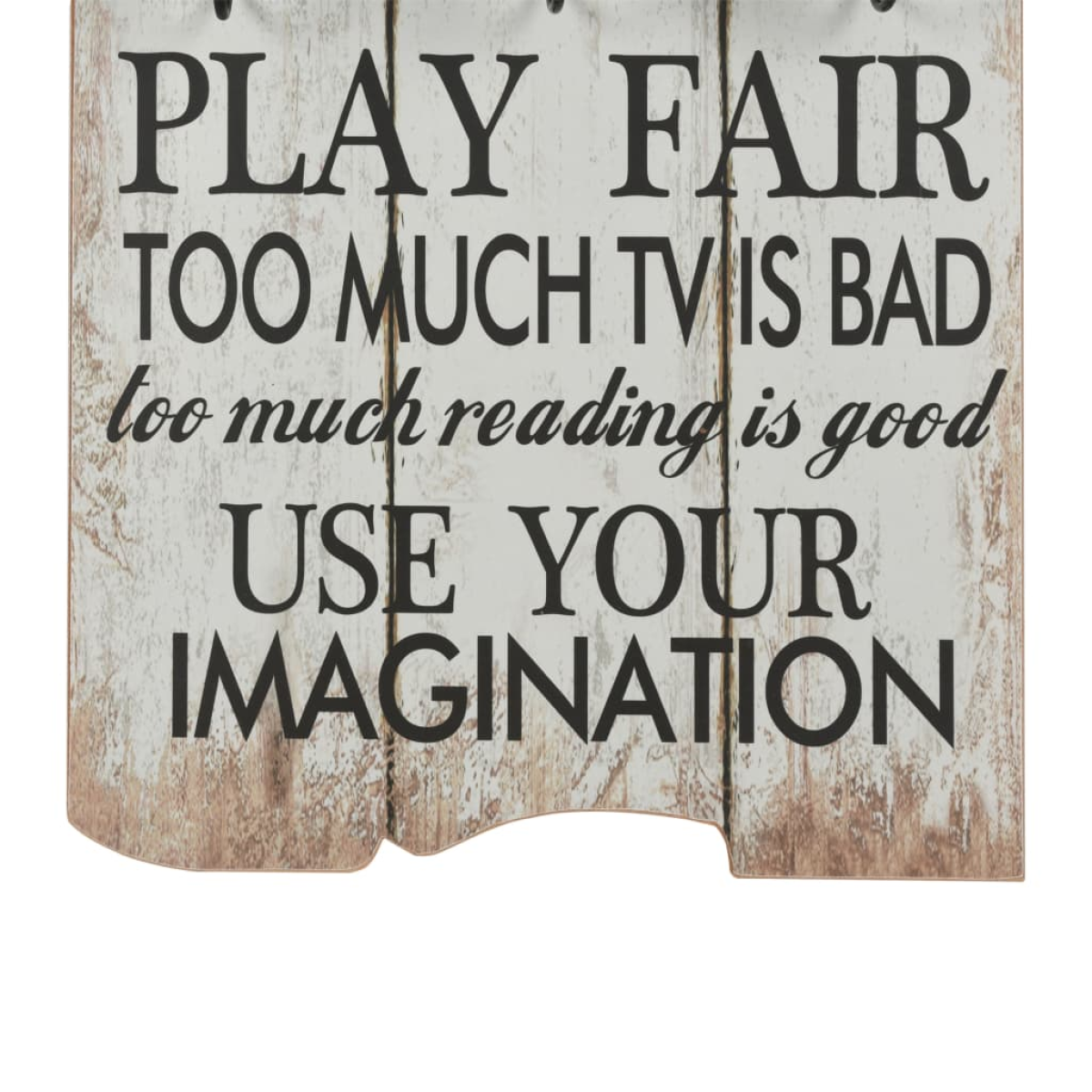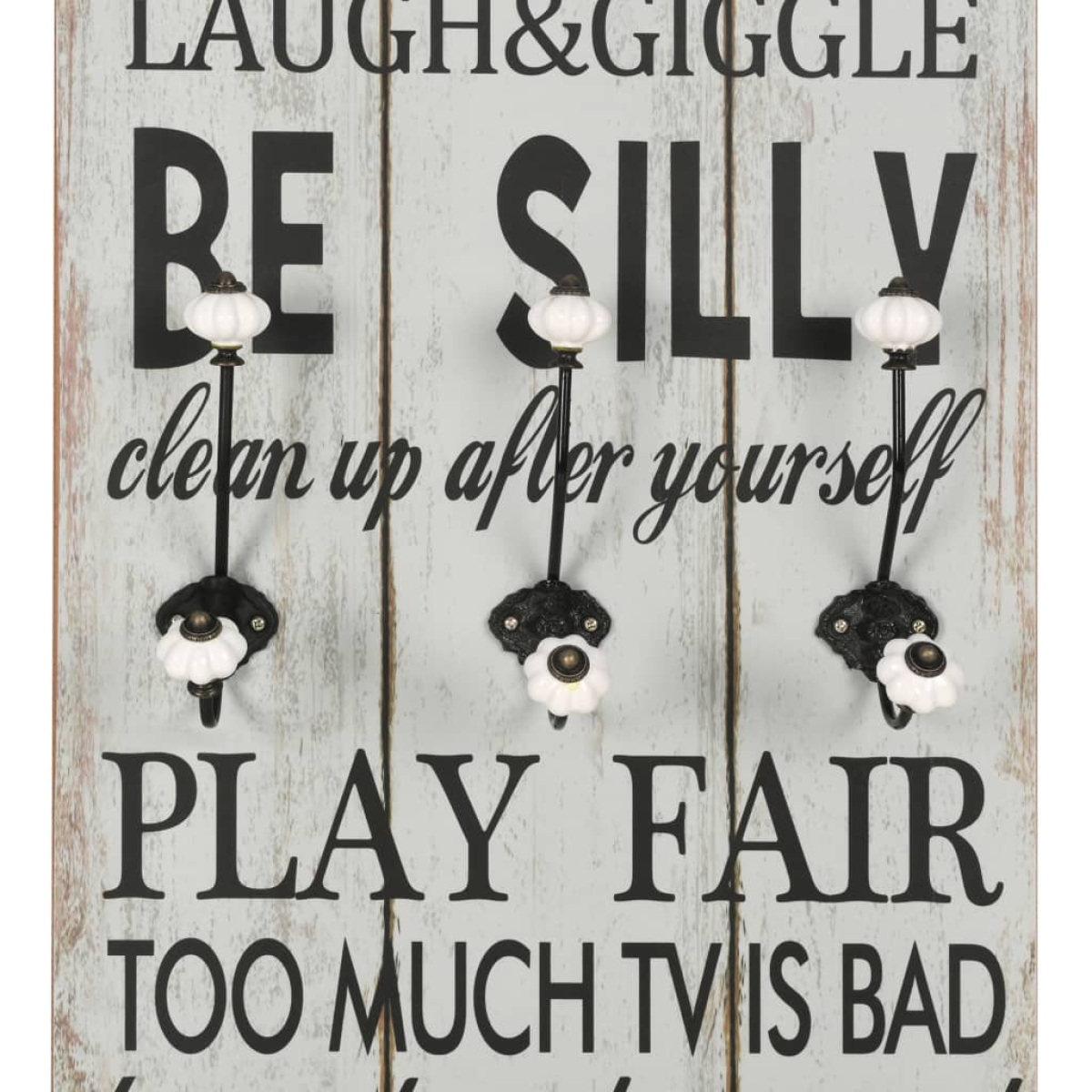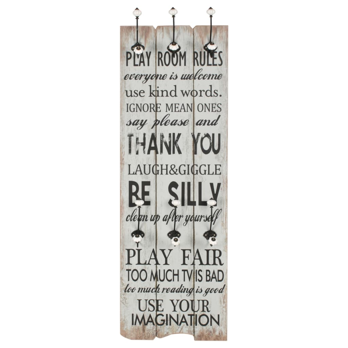 With its vintage-style print reading "Play room rules Ignore mean ones Thank you Be silly Play fair Use your imagination", this wall-mounted coat rack with 6 hooks will become a real eye-catcher that your guests will immediately notice. The coat rack is made of MDF board, which is very sturdy. Designed with two rows of three exquisite metal hooks, the coat rack has ample space for your coats, bags, scarves, hats or other small items. With two attachment points on the back, the coat rack can be easily mounted onto the wall. The assembly is easy. Delivery also includes the required mounting materials.