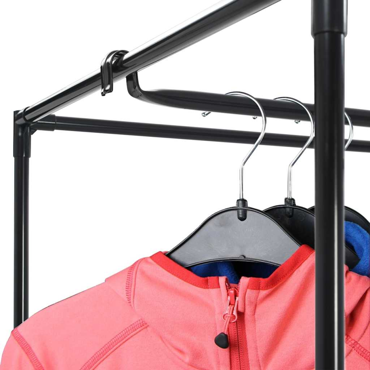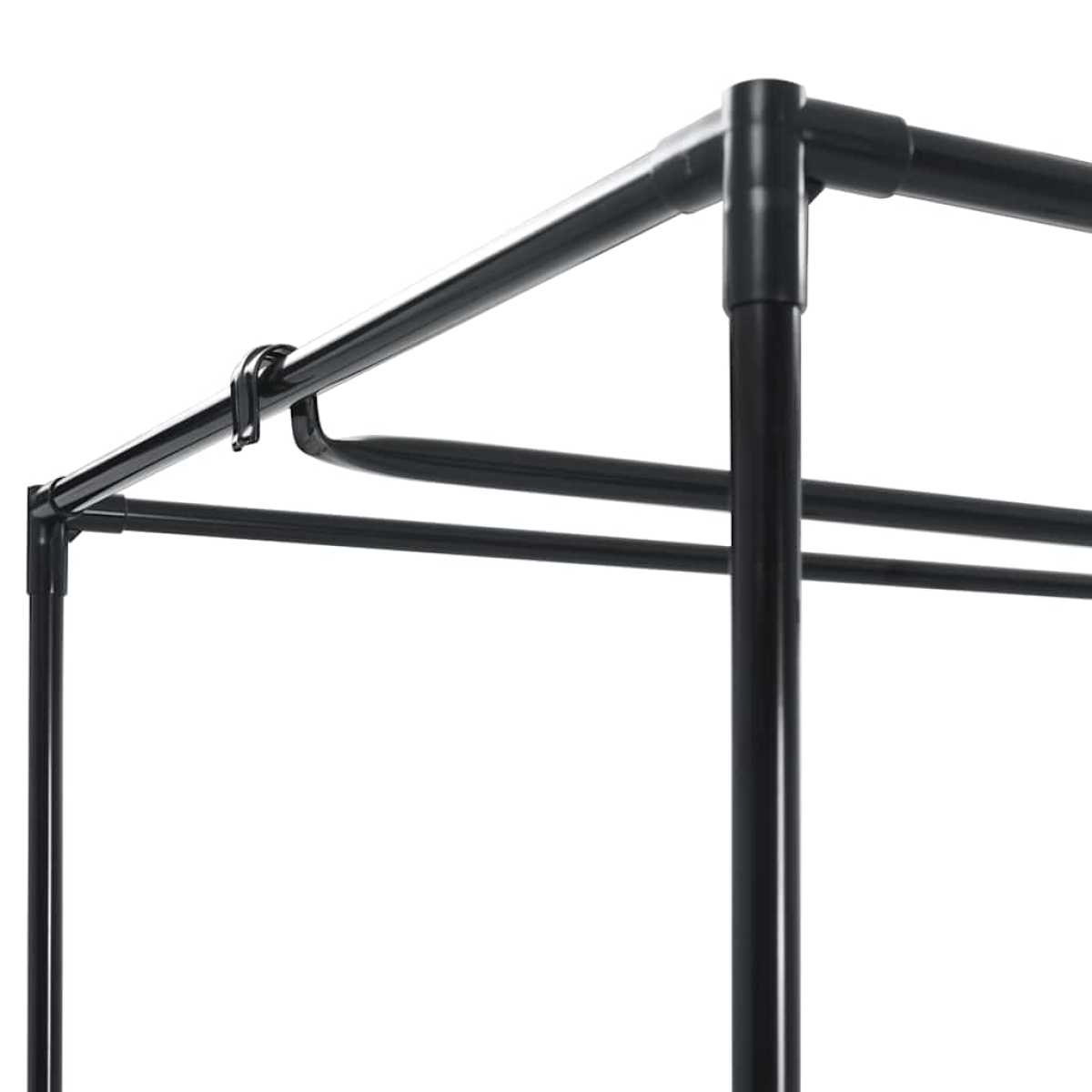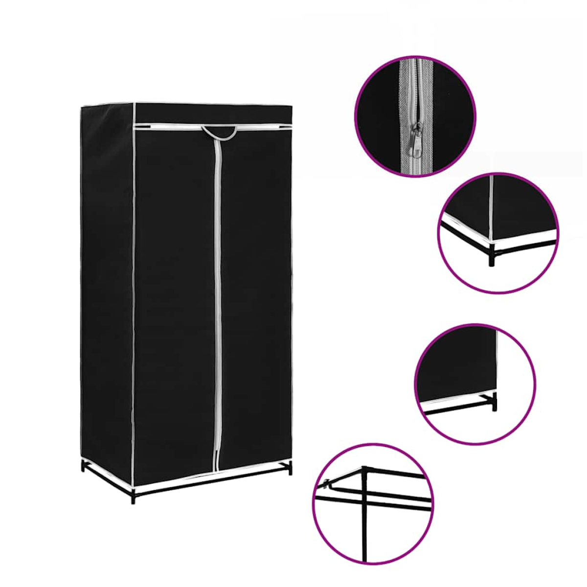 Featuring a sturdy iron frame and fabric cover with zippers, the wardrobe can protect your clothes from dirt and dust. The practical plug-in system makes it possible to mount this wardrobe without drilling or screwing. The base frame consists of sturdy iron tubes, which are joined together with connectors. The fabric cover is made of breathable polyester. The wardrobe consists of a main part with a clothes rail.