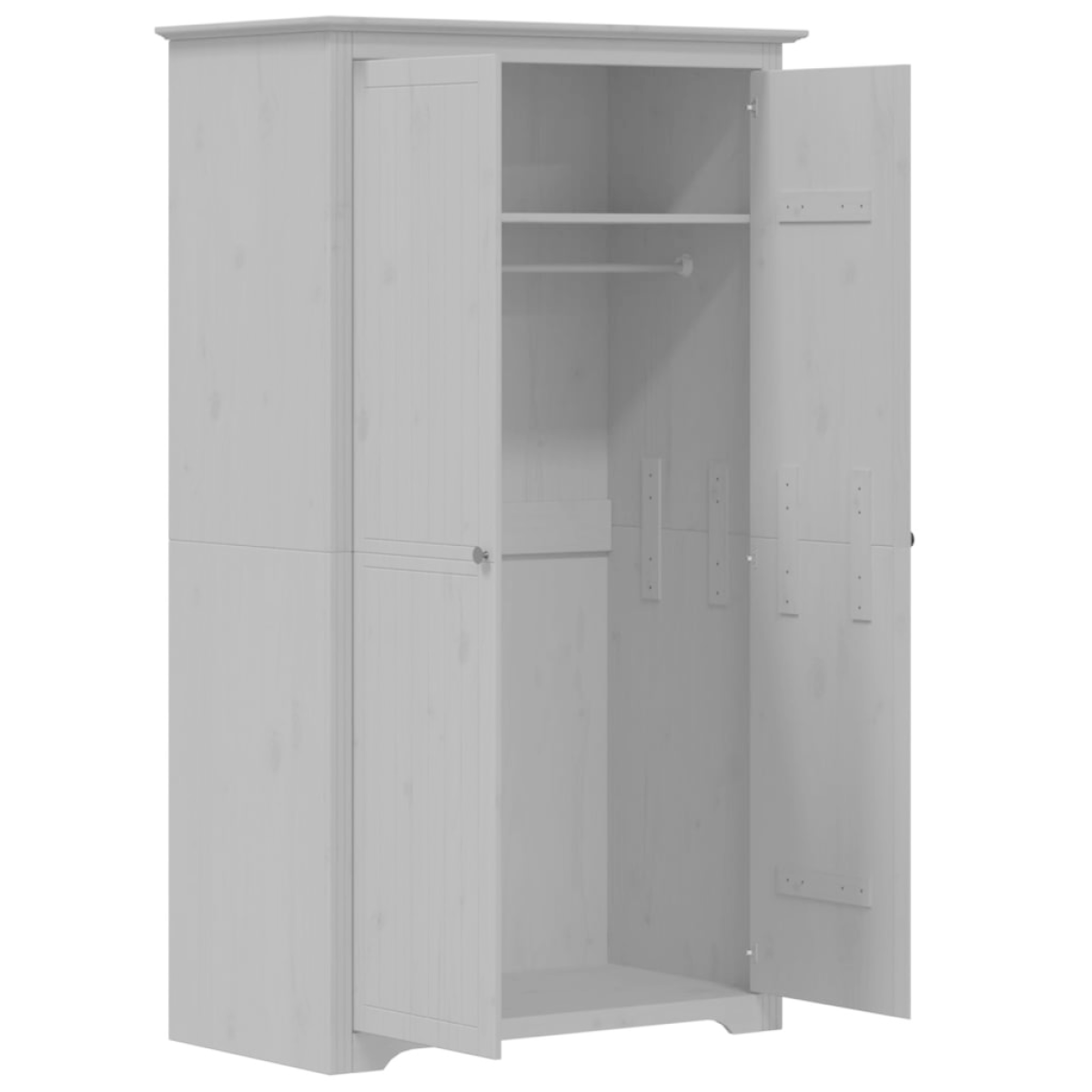 This classic wardrobe, featuring a French design, offers ample storage space to keep your clothes, shoes and accessories neatly organised. Solid pine wood: Solid pine wood is a beautiful natural material. Pine wood has a straight grain, and the knots give the material its signature, rustic look.Spacious storage: The closet contains a hanging rail for storing clothes, allowing you to hang your clothing items neatly and prevent them from getting wrinkled. The armoire also has a top shelf for additional storage, giving you more space to store items such as bags or folded clothes.Practical doors with metal handles: Keep your essentials free from dust by hiding them behind the doors of the storage cabinet. The metal handles on the doors make it easy to open and close the doors.Charming French style: Add an inspiring French style to your interior decor! Warning:To prevent it being overturned, this product must be used with the provided wall attachment device.
