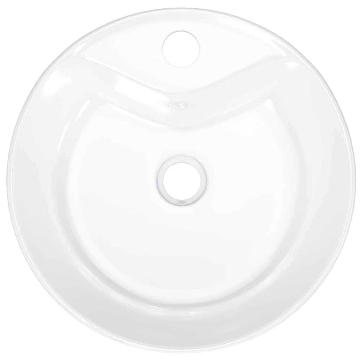 This wash basin, made of ceramic, makes a stylish and eye-catching addition to any bathroom, washroom or powder room. Durable material: The bathroom basin is made of smooth ceramic. Ceramic materials are tough and durable. This material is a long-lasting choice.Elegant style: The wash basin features a beautiful round shape, giving your bathroom a simplistic yet elegant style.High gloss finish: The high gloss finish adds a charming touch to this washroom basin and makes it easy to clean.Practical overflow: The sink basin is equipped with an overflow preventing option to allow the water out when it gets too full. Note:The tap and the drain are not included in the delivery.