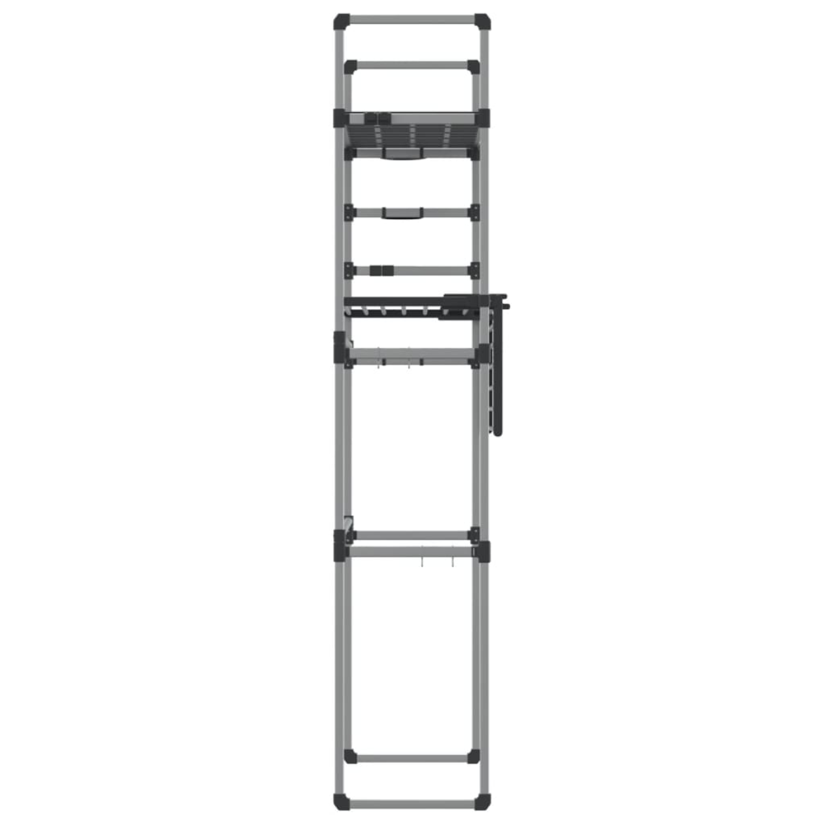 Are you still worried about the lack of storage space in the bathroom, or too many things to organise? This washing machine shelf is your ideal storage solution! Sturdy material: Aluminium metal is lightweight and strong. It's resistant to corrosion with a self-protecting oxide layer. The aluminium frame of the washing machine shelf rack ensures sturdiness and stability.Ample storage space: The over-the-toilet shelf offers ample storage space for keeping daily bathroom essentials well-organised and drying laundry. The hooks and fittings on both sides also provide you with extra storage space to keep things tidy.Adjustable height: Thanks to the adjustable height, this over-the-toilet storage is flexible enough to be built-in over a toilet, laundry basket or washing machine.