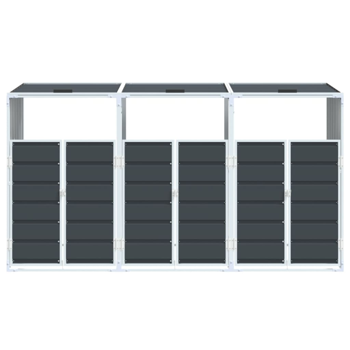 This wheelie bin storage discreetly hides your garbage bins in the garden, transforming your outdoor space into a beautiful and tidy environment. Strong and durable material: The powder-coated steel provides strength, stability, durability, and resistance to corrosion and harsh weather conditions, ensuring long-lasting performance.Practical lid mechanism: The lid comes with chains that connect your bin's lid to it, so the bin lid opens automatically when you lift the lid of the bin store.Easy access: The front doors with a latch system make it a breeze to remove and replace the bins, ensuring waste disposal is effortless.Good ventilation: These vents on the panels promote air circulation, preventing odour buildup and keeping your bins fresh.Flexible design: You can expand this wheelie bin storage to hold more bins by adding extra extensions. These extensions are available for individual purchase at the store.