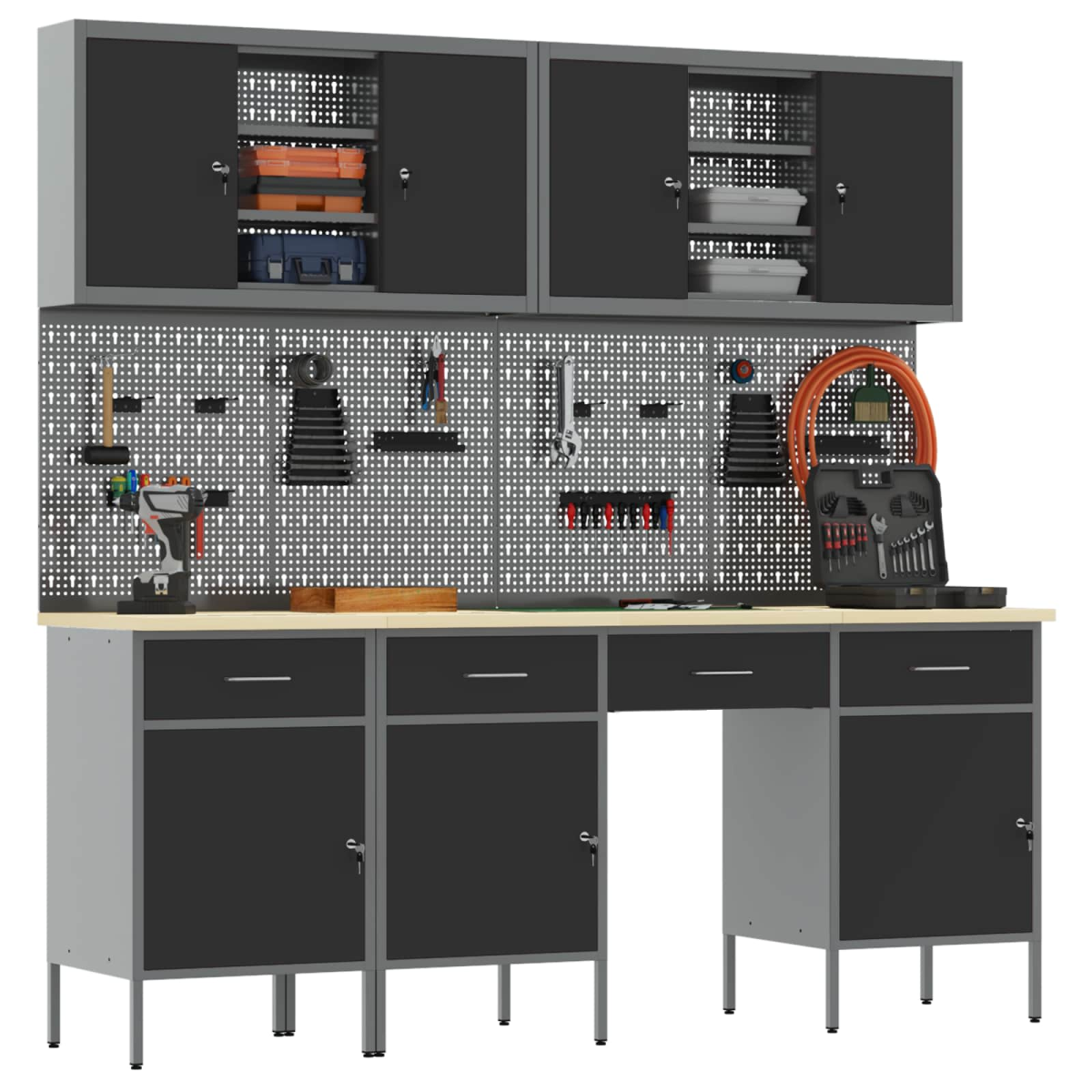 This Modern Work Cabinet seamlessly merges form and function with its industrial style and robust design. Suitable for workshops, its innovative construction using engineered wood and steel showcases a unique rectangular shape. This cabinet is perfect for organizing tools and enhancing the workspace experience, catering to both hobbyists and professionals. The industrial design, inspired by urban lofts, adds an aesthetic edge to your workshop setup, combining raw materials for a chic look. Steel Framework: Utilizing engineered wood and steel, this cabinet ensures durability and longevity within your workspace. The strong framework provides a reliable and robust foundation for storing heavy tools and equipment. Despite its solid build, the materials offer a sleek appearance, enhancing the aesthetics of any workshop environment. Maintenance is straightforward, requiring a simple wipe with a damp cloth, preserving its pristine look. Versatile Storage: Equipped with compartments, drawers, and shelves, this cabinet offers extensive organizational solutions. These components enable efficient arrangement of tools and materials, optimizing workspace and ensuring everything is in its rightful place. Its intelligent design caters to a variety of storage needs, from large tools to small accessories, making it indispensable for organized workspaces. Industrial Design: Reflecting urban loft styles and incorporating raw materials, this cabinet's design perfectly complements modern workshop décor. Its industrial aesthetic appeals to contemporary and classic tastes alike, featuring a seamless blend of utility and style. This balance ensures the cabinet stands out as both a functional and attractive piece of tool organization hardware. Simple Maintenance: Keeping the cabinet clean is hassle-free with its material choice requiring minimal effort. Regular wiping with a damp cloth suffices to maintain its clean appearance. This low-maintenance aspect allows owners to focus more on their tasks rather than upkeep, enhancing productivity and efficiency. Efficient Assembly: Designed for straightforward construction, assembling the cabinet requires two people with basic tools like a screwdriver. This simplification of setup ensures you spend more time organizing and less on installation. Detailed instructions facilitate a smooth buildup process and quick integration into your workspace.