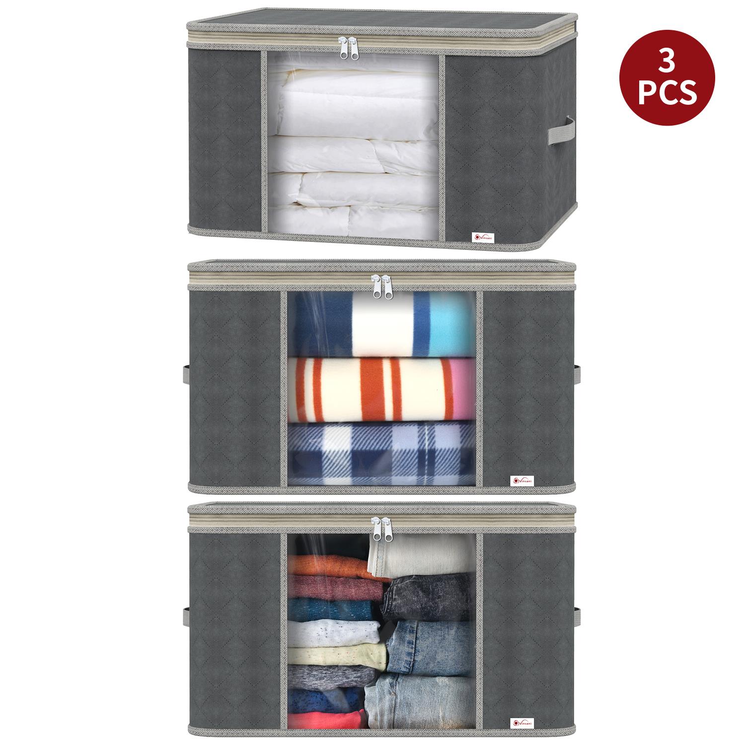 ENORMOUS CAPACITY: Comes in a set of 3 bags, each measuring 60 X 43 X 35 cm. Clothing, blankets, pillows, comforters, and other household goods can all be stored in this huge storage bag. These can also be used to hold shoes, toys, small electronics, stationery, towels, and groceries, among other things. These storage bag organizers will come in handy for your household.