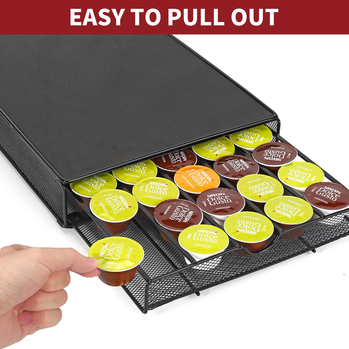CONVENIENT CAPSULE ORGANISER: This sliding storage drawer holds up to 80 Dolce Gusto capsules, letting you keep your favourites like espresso, latte, and cappuccino neatly organised and accessible. SPACE-EFFICIENT DESIGN: Make the most of your countertop