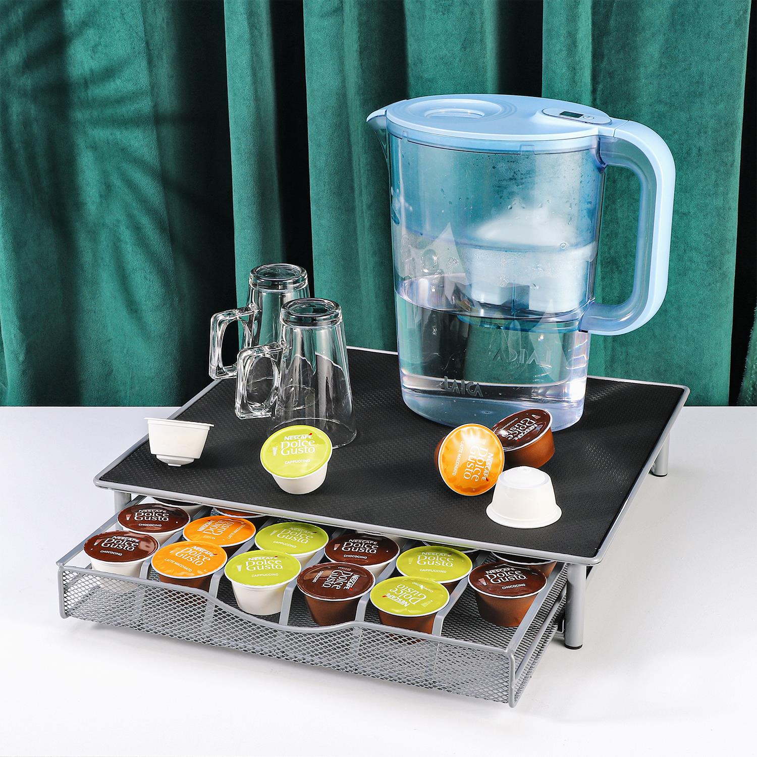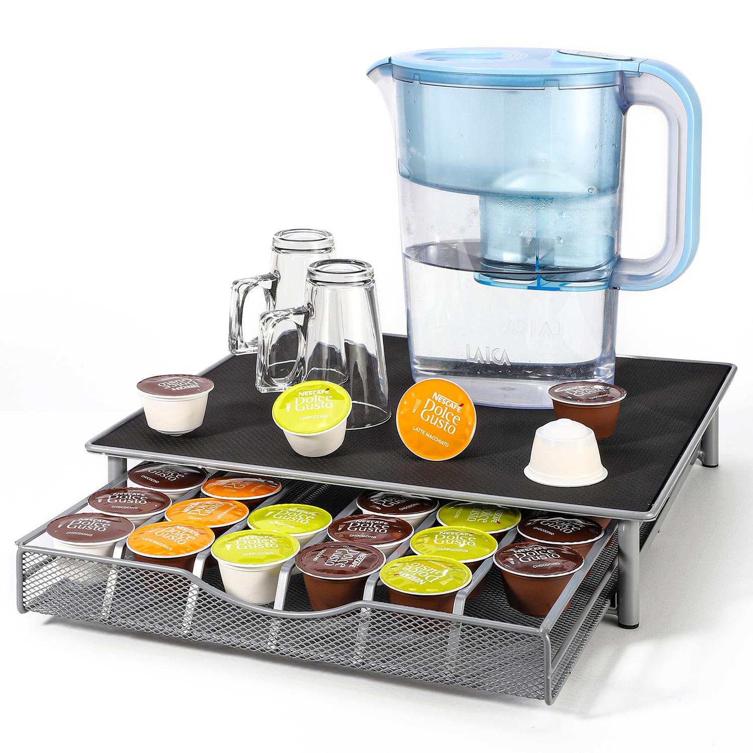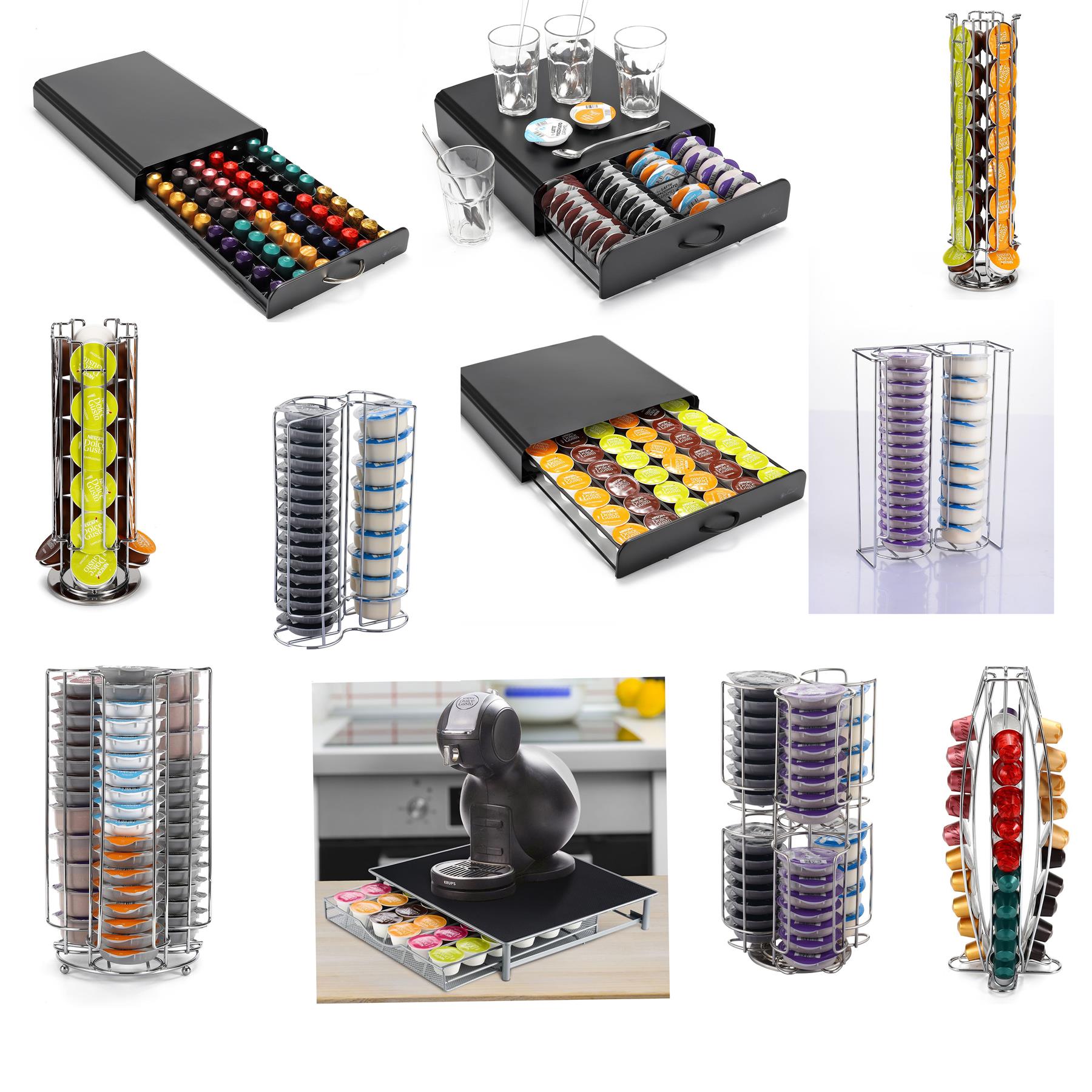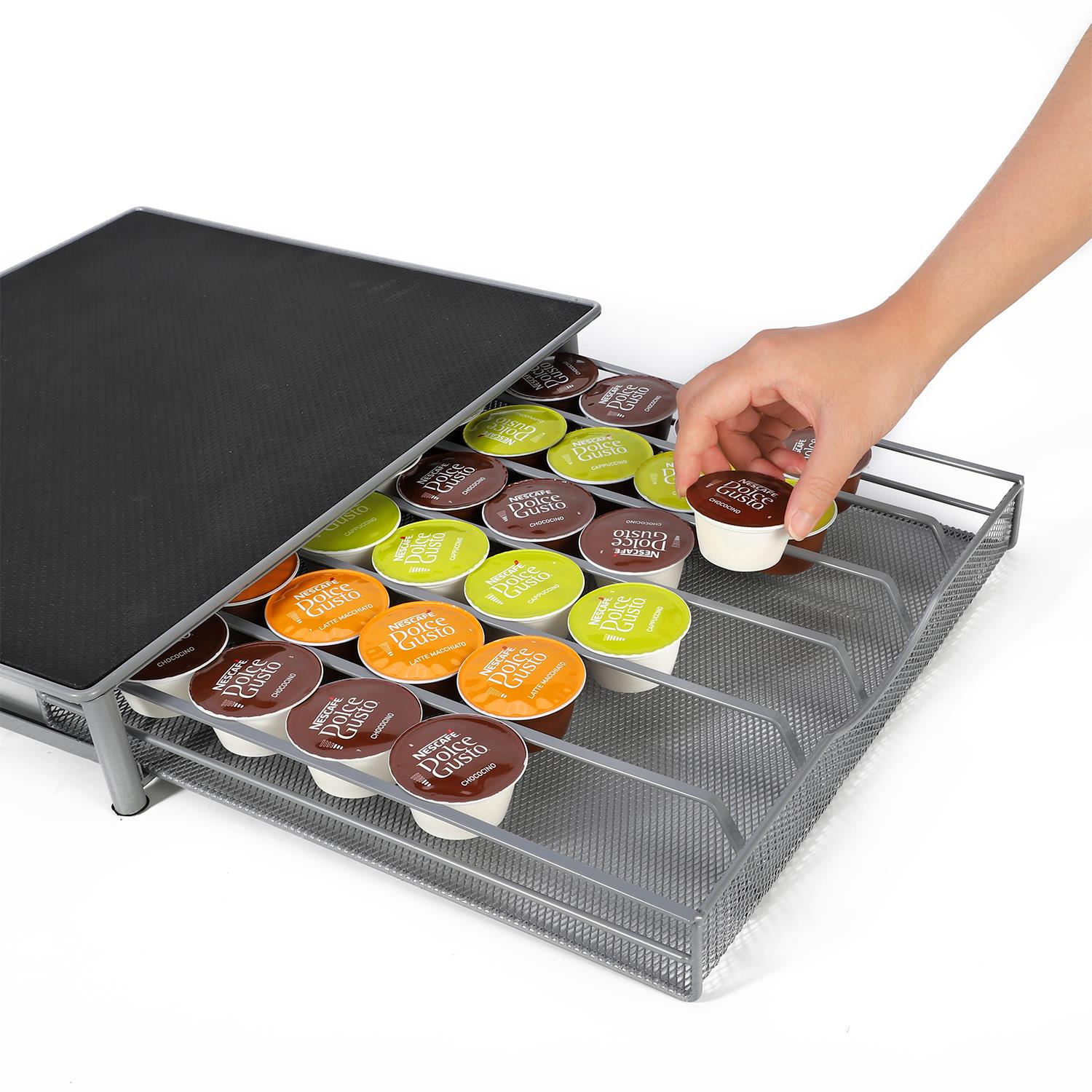 FEATURES - Coffee pod stand can store between 24 to 48 Coffee Capsules. Suitable for Dolce Gusto, Tassimo, Nespresso or other pods