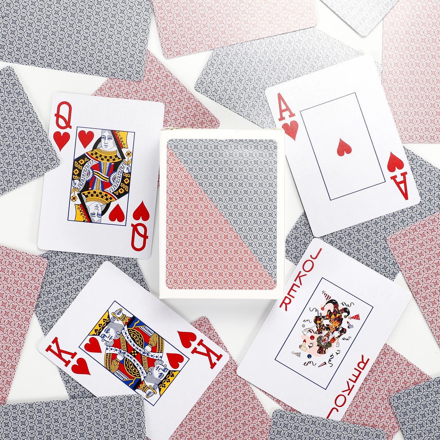 DESIGN: All cards have a check design backing with standard card faces and come in red and blue decks.