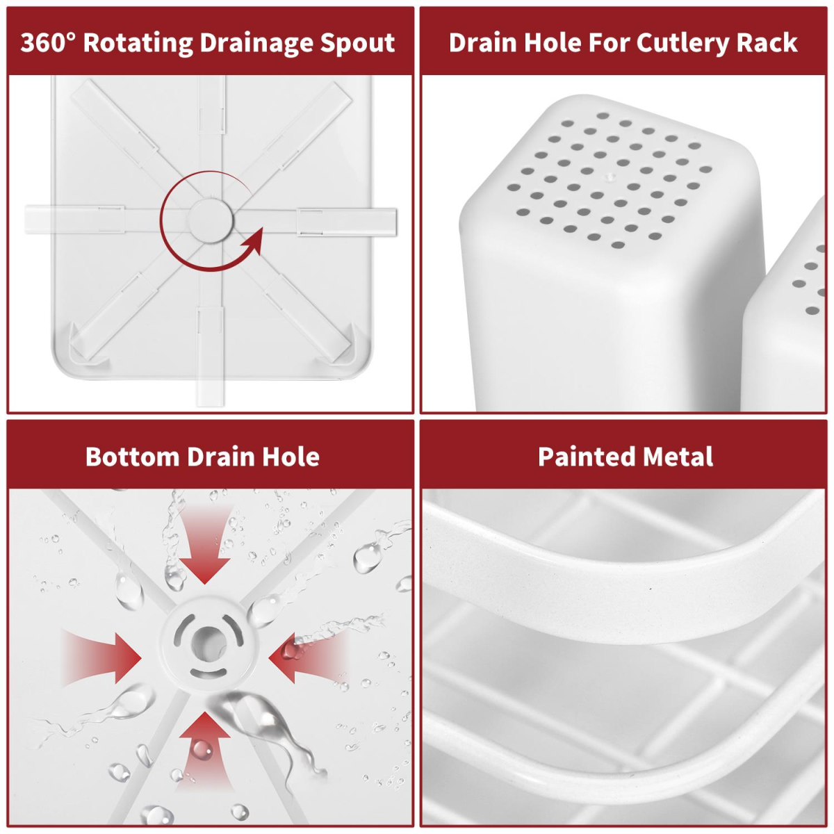 EFFICIENT DRAINAGE SYSTEM: Equipped with a 360-degree rotating drainage tube and removable drip tray, this rack ensures water is directed back into the sink, keeping your kitchen countertop dry and tidy.