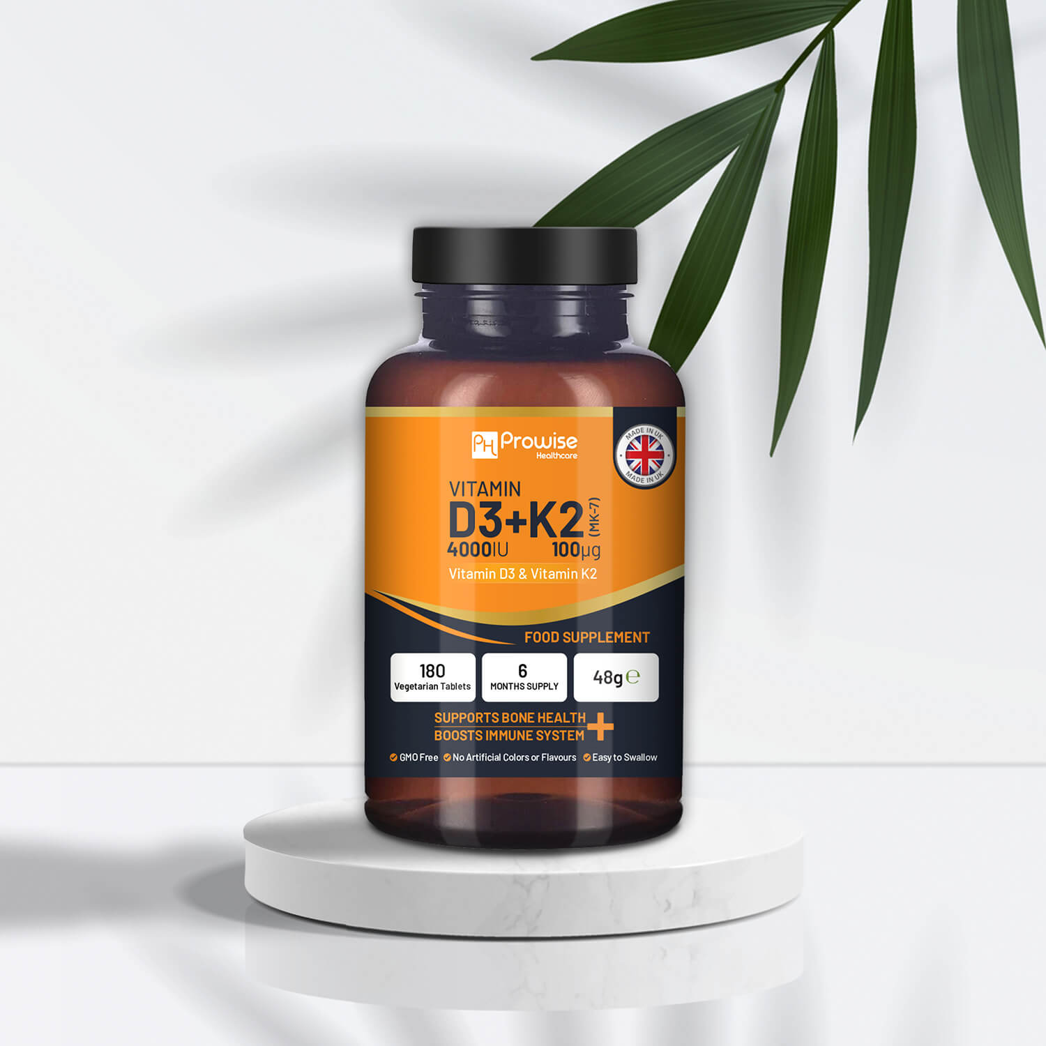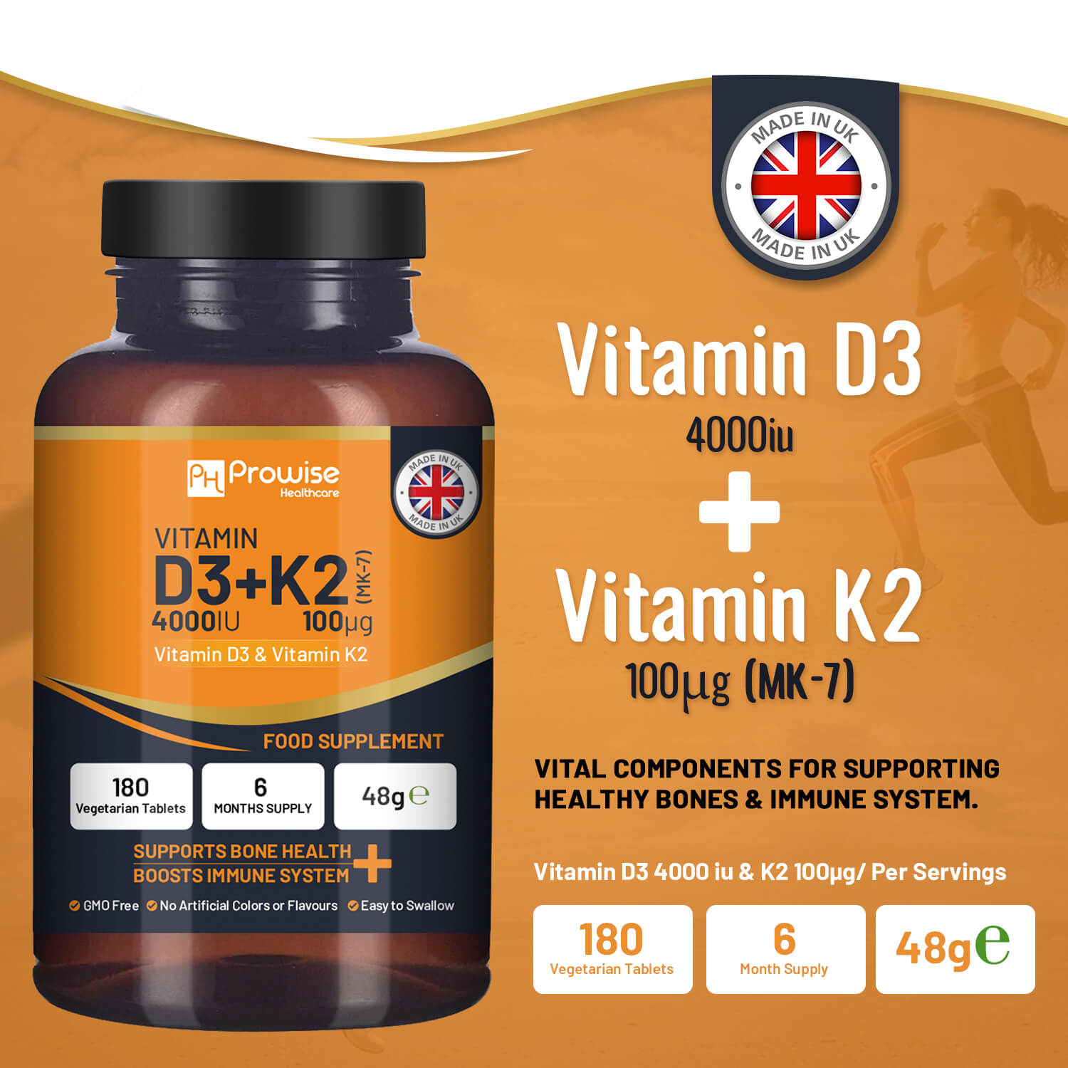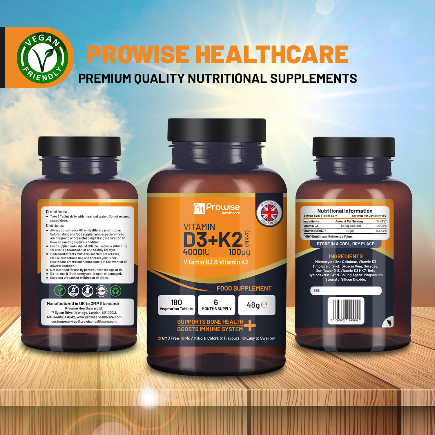 Vitamin D3 4000IU & K2 MK7 100μg Vegetarian 180 Tablets Supplement for Immune Support Calcium Boost, Bone & Muscle by Prowise