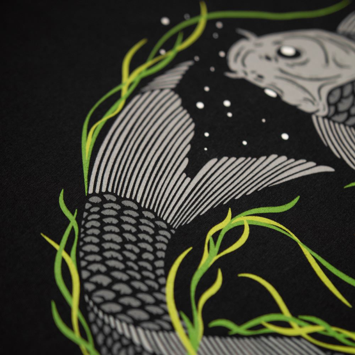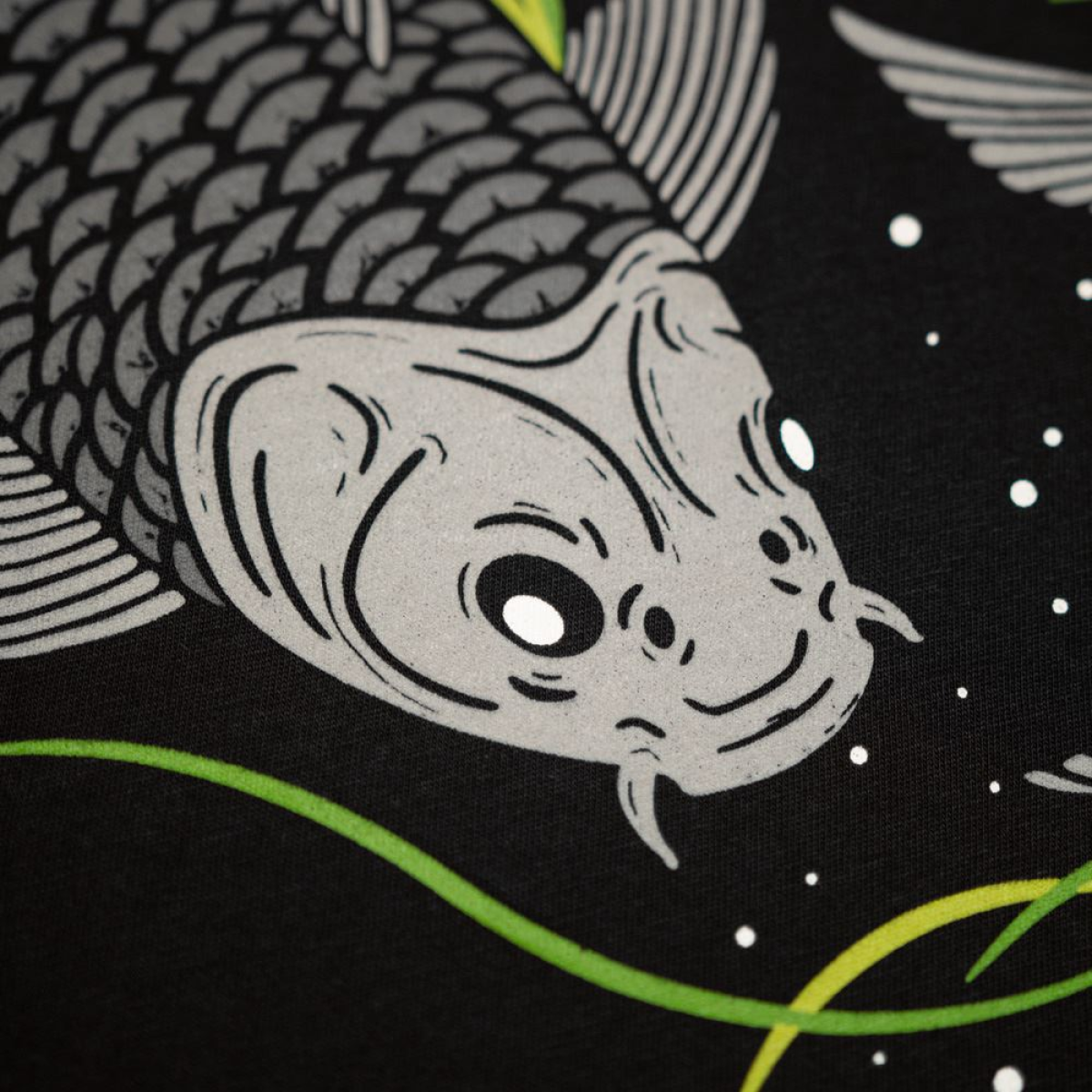 .Hand drawn from the ground up, our Vortex graphic depicts 2 carp circling in unison through weed beds. 5 colour screenprint consisting of muted greys with contrast green on our on our super soft luxurious 320g brushed back fabric with colour-matched dipped cord ends.
