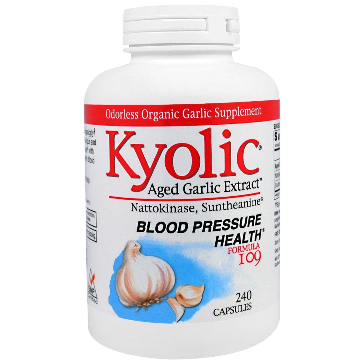 Odorless Organic Garlic Supplement Aged Garlic Extract Nattokinase, Suntheanine GMP Certified Kyolic Aged Garlic Extract begins with 100% organically†grown garlic bulbs. Kyolic Formula 109 contains a unique and natural combination of Nattokinase and Suntheanine with Aged Garlic Extract to help relax and support healthy blood pressure through different pathways. Clinical Studies have shown these ingredients can help support healthy blood pressure levels. (†In compliance with the California Certified Organic Farmers).