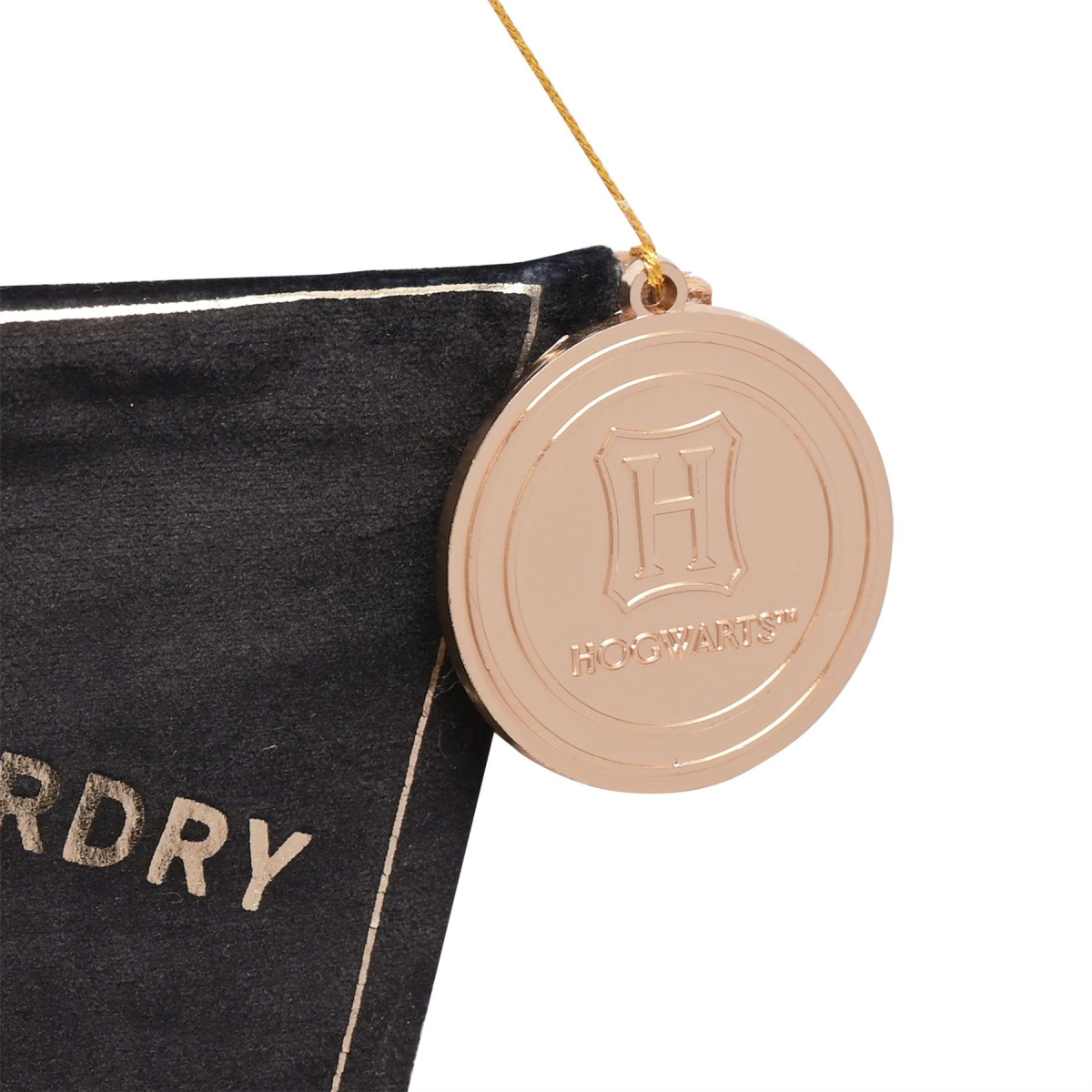 A Hogwarts alumni hanging banner from Harry Potter by WARNER BROS�. This iconic banner recreates Hogwarts magic at home for fans of the wizarding world. The black fabric triangular banner showcases gold edging, complete with gold printed �Hogwarts� title, gold tassel and �Hogwarts stamp� embellishment. It is designed for wall display using the attached gold thread hanger. The banner is packaged with a hang tag/PP bag.