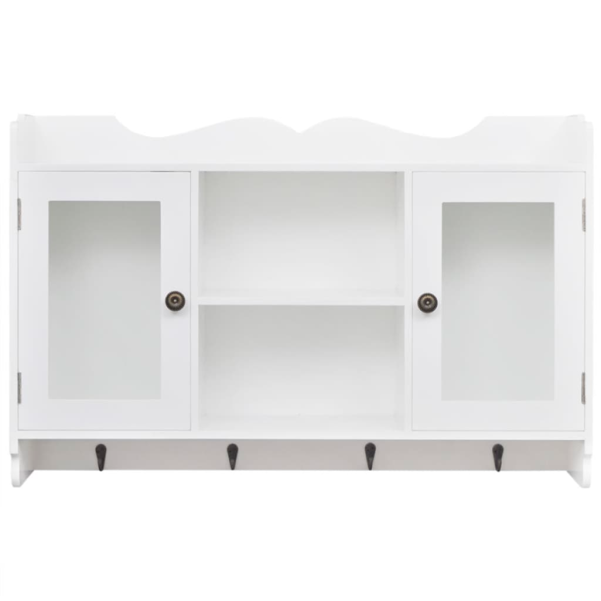 This display cabinet will become the focal point of any room. With an invisible mounting system, the display cabinet is easy to install, and serves as an ideal place to store items like trophies, books, collectables, ornaments, etc. The hanging cabinet is made of high-quality painted MDF. It has two glass panel doors to keep the items inside dust free. With 4 hooks at the bottom of the cabinet, you can hang your coats, bags, caps, keys, etc. This display cabinet will suit any decor and turn an empty wall into a feature!
