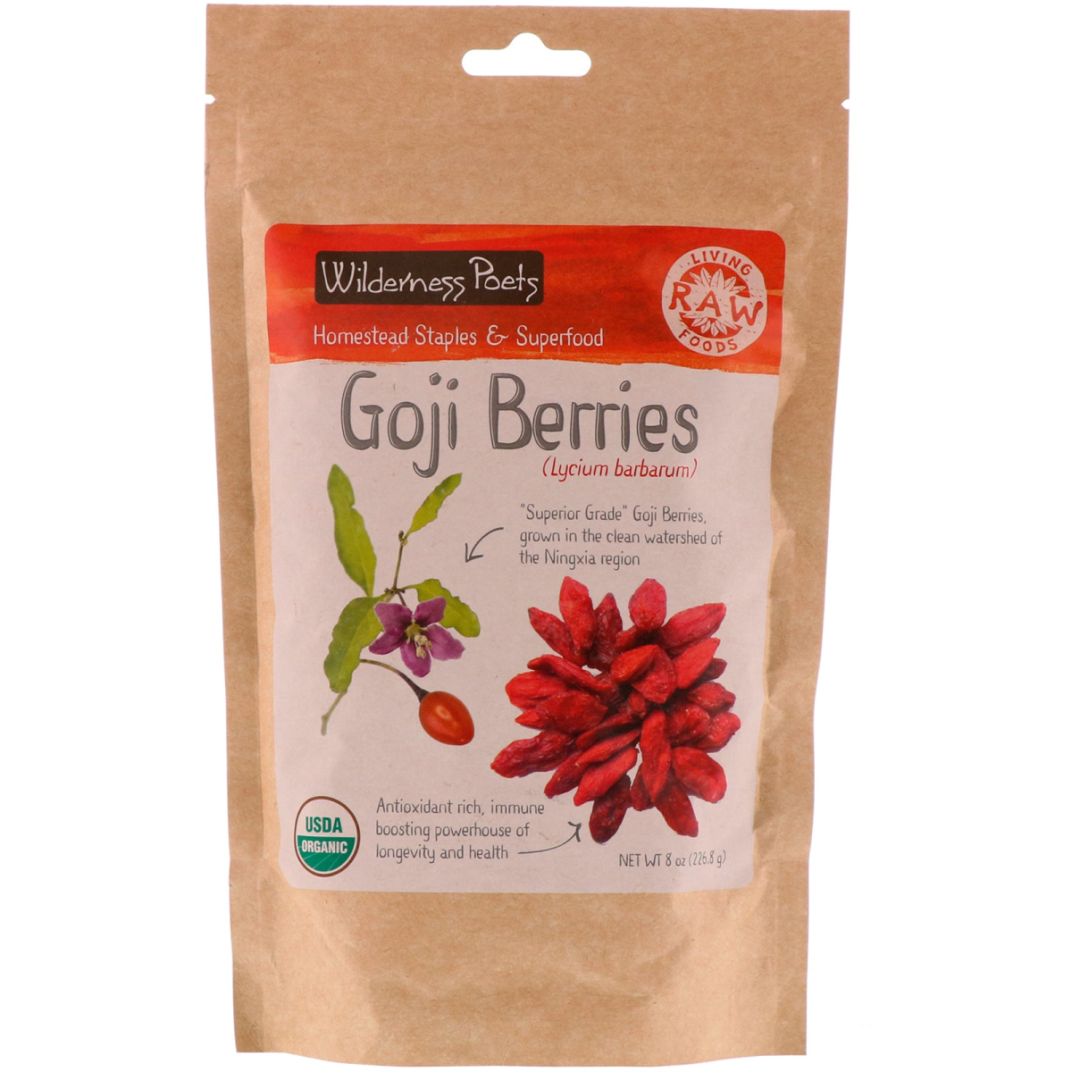Homestead Staples & Superfood Lycium Barbarum USDA Organic Certified Organic by Organic Certifiers Non-GMO Gluten Free Raw Vegan No Added Sugar or Salt "Superior Grade" Goji Berries, grown in the clean watershed of the Ningxia region. Antioxidant rich, immune boosting powerhouse of longevity and health. Wilderness Poets Goji Berries are bursting with flavor! With subtle vanilla notes and a hint of smokiness, these gems have been used medicinally for over 5,000 years by herbalists in China, Tibet, and India. They can be blended directly into smoothies, juices, elixirs, oatmeal, and raw desserts. Goji Berries are wonderful soaked in herbal tea, as they balance the bitterness of medicinal herbs and synergize deep flavors. Goji Berries are known to balance blood sugar, enhance eyesight, increase stamina, boost the immune system, cardiovascular health, and promote longevity.