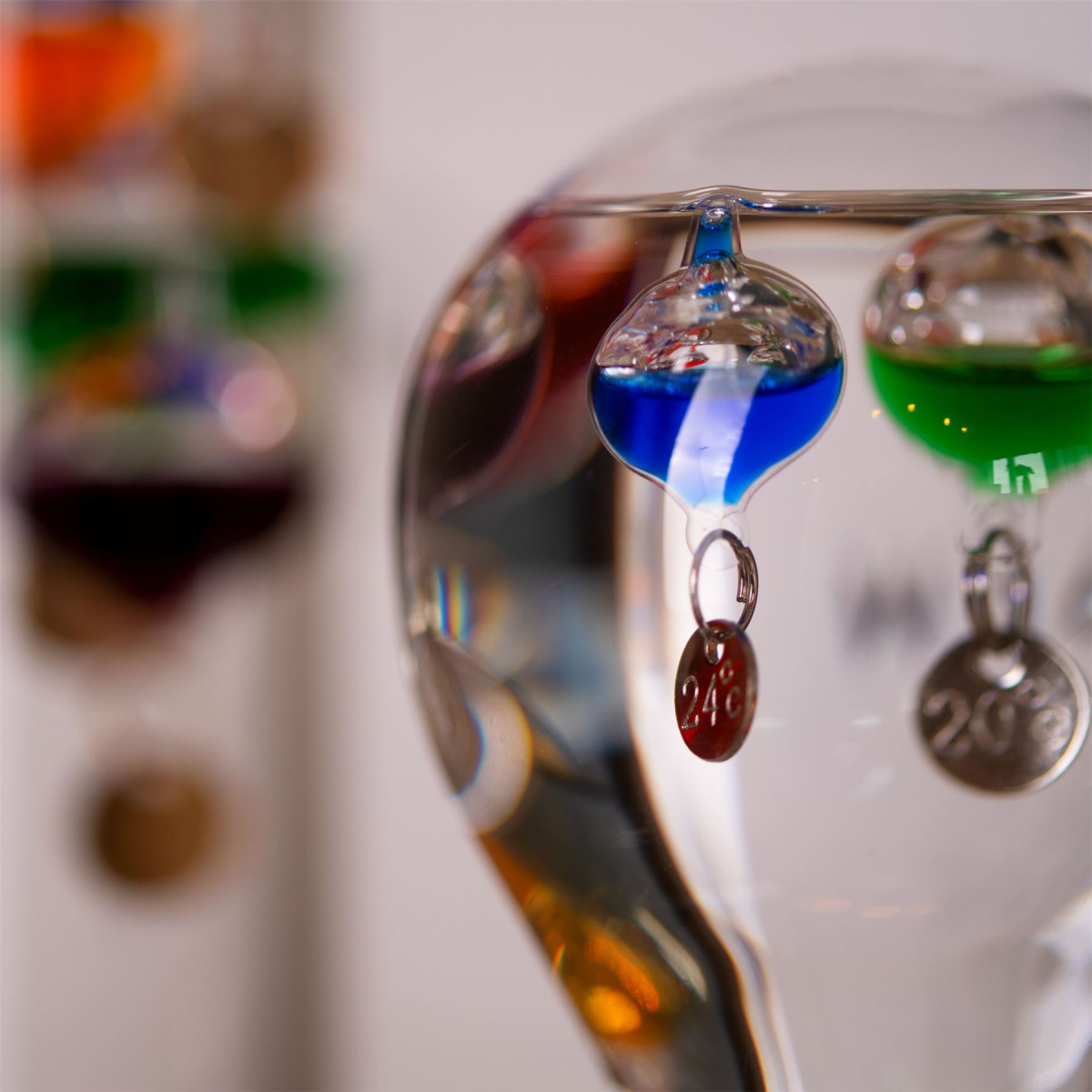 It contains small glass vessels of varying densities which rise or fall throughout the day to indicate the temperature. The glass bulb stands magnificently within a matching metal stand.