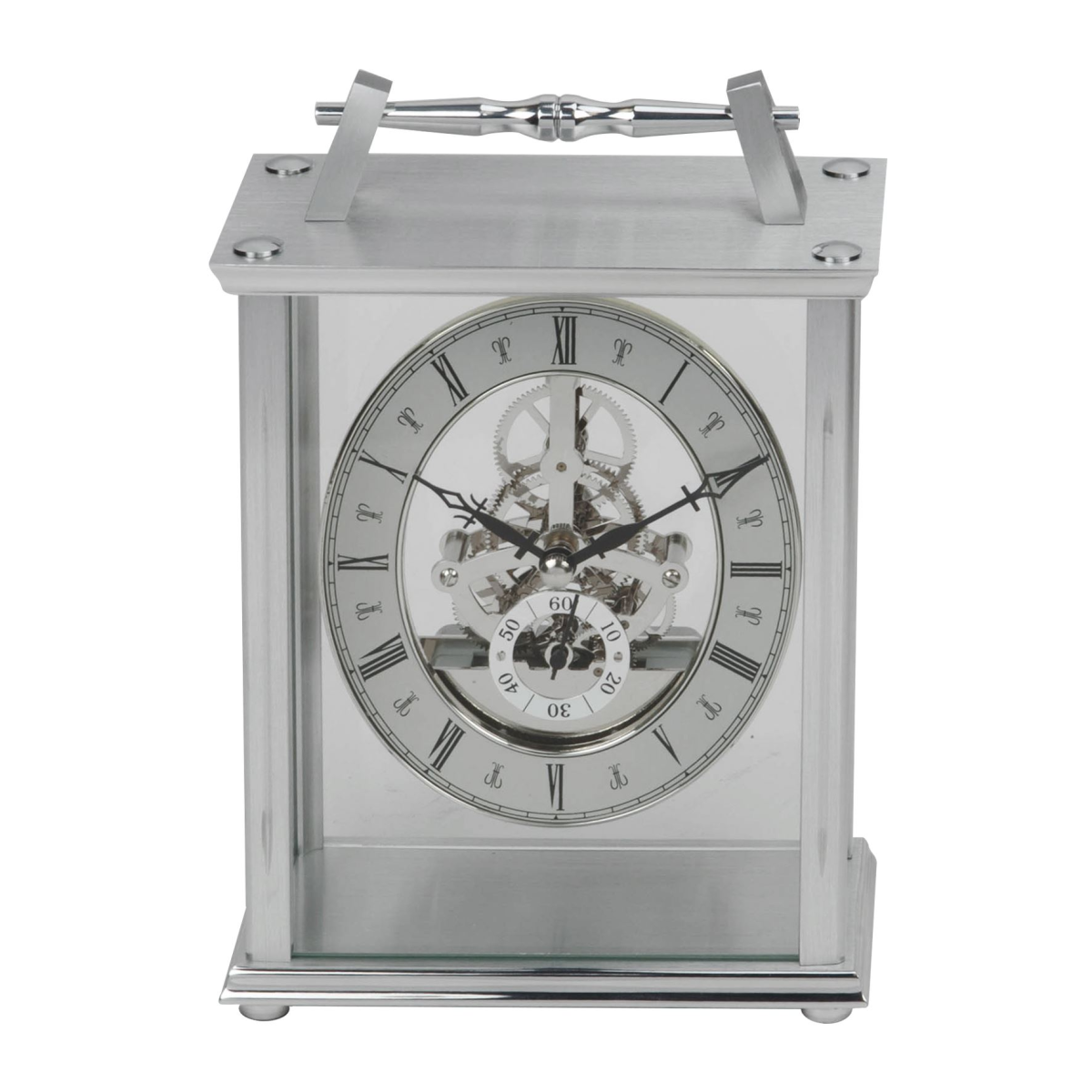 This 20cm tall clock features a classic carriage clock shape with stylish brushed steel frame and chrome finish handle. The floating oval face includes a classic Roman dial, cut out hands and an intricate and highly precise quartz skeleton movement. The clock also features a small seconds dial.