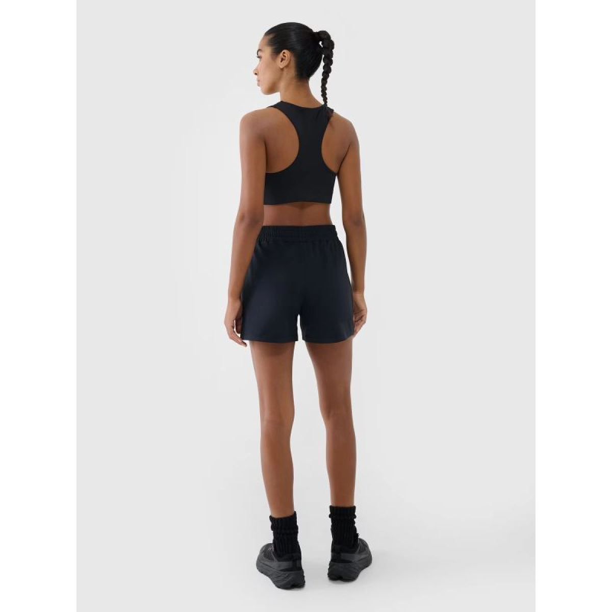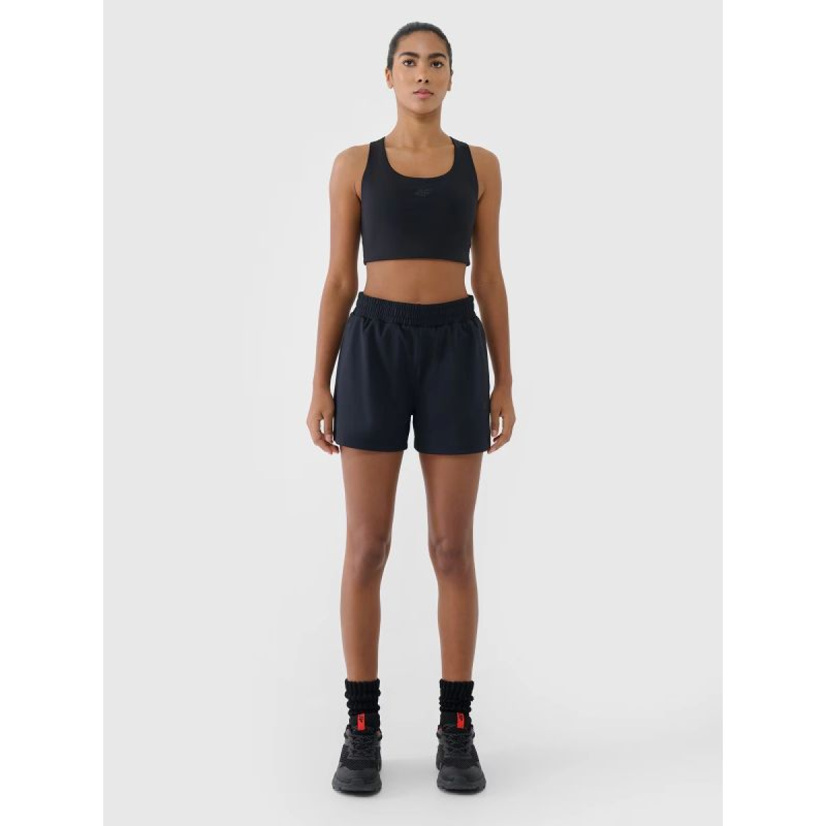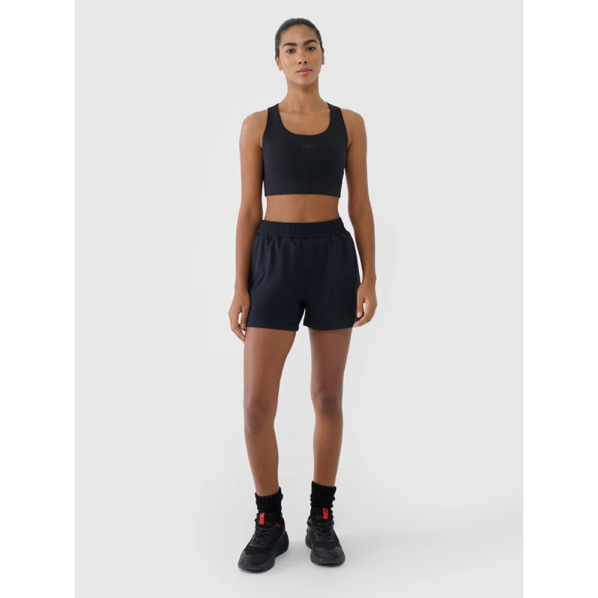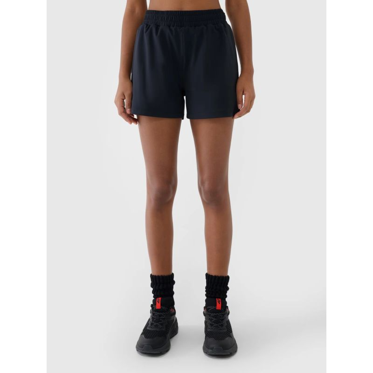 4F women's training shorts provide reliable support and comfort at every stage of your workout . Thanks to quick-drying, stretchy materials and a comfortable fit , the shorts allow for complete freedom of movement and maximum focus during exercise . They feature a regular fit that comfortably hugs your figure, a high waist, and short legs for enhanced coverage and comfort.