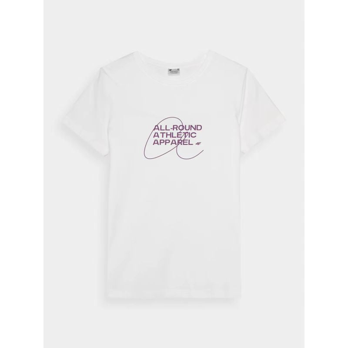This women's printed T-shirt is perfect for both casual and everyday sporty outfits. It has a slim fit that fits close to the body and a standard hip-length cut. The single jersey weave with a smooth surface on one side makes it flexible and comfortable to wear. The 4F women's T-shirt is made of 100% cotton, making it soft, durable, and pleasant to the touch. The crew neckline is finished with a light ribbed trim. The "All-Round Athletic Apparel" lettering is visible on the front.