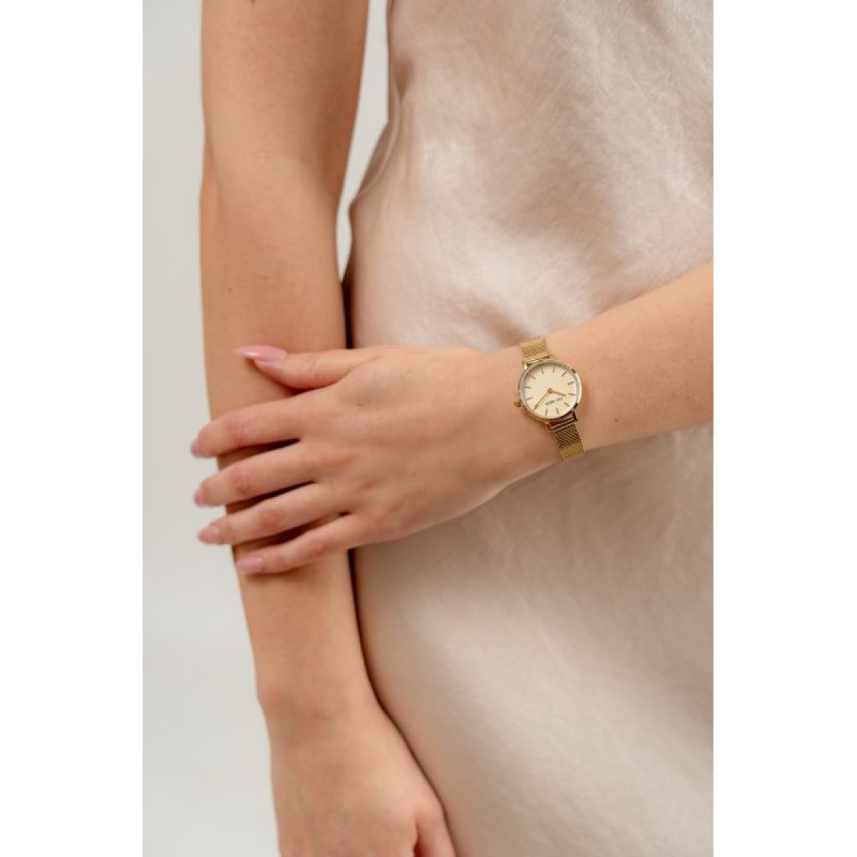 A delicate mesh bracelet adds sophistication and sensuality to any outfit. Crafted from high-quality stainless steel, it combines elegance with durability and comfort. The sensual nature of this gold bracelet makes it perfectly suited to a woman's wrist, delicately enveloping it and emphasizing its femininity. A subtle logo on the bracelet clasp completes the look, adding an exclusive touch.