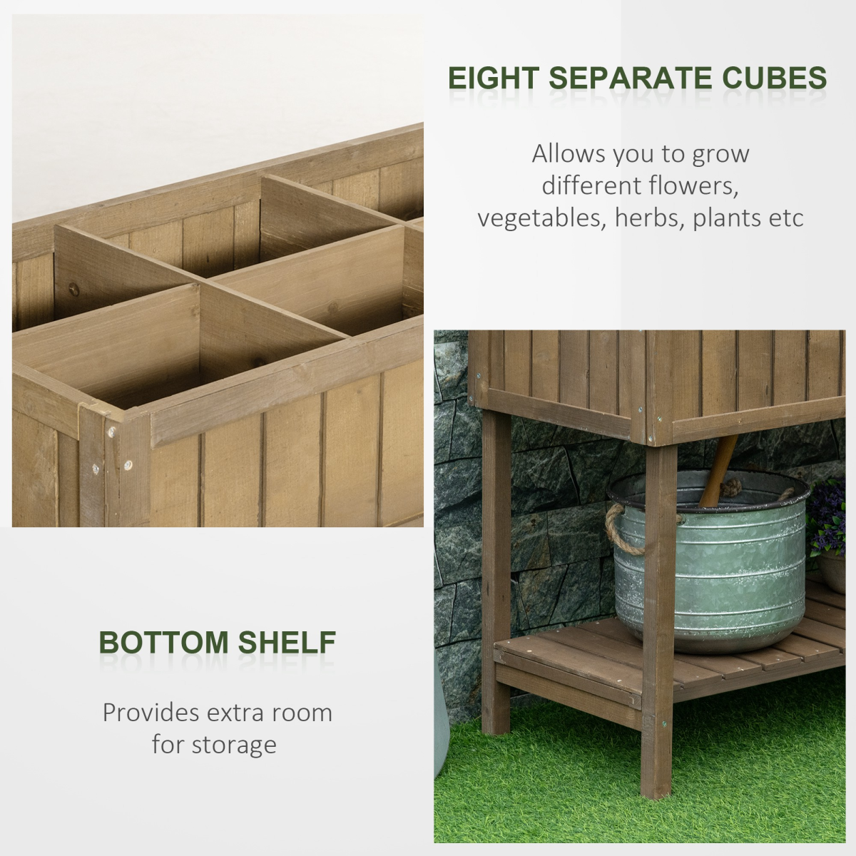 - Wooden Raised Bed Container Garden Plant Stand 8 Boxes 110x46x76cm Brown - Description: - Crafted from fir wood with water-resistant paint all over to ensure prolonged strength and reliability both indoors and outdoors - Features eight separate cubes, providing plenty of room for you to grow and nurture plants flowers, vegetables, herbs and fruits etc. - Drainage hole on the bottom of each cube - Lower shelf for extra storage room – great for gardening tools and equipment - Four feet for elevated design, prevents the ground and grass from touching the potter - Maximum weight 80kg, assembly required