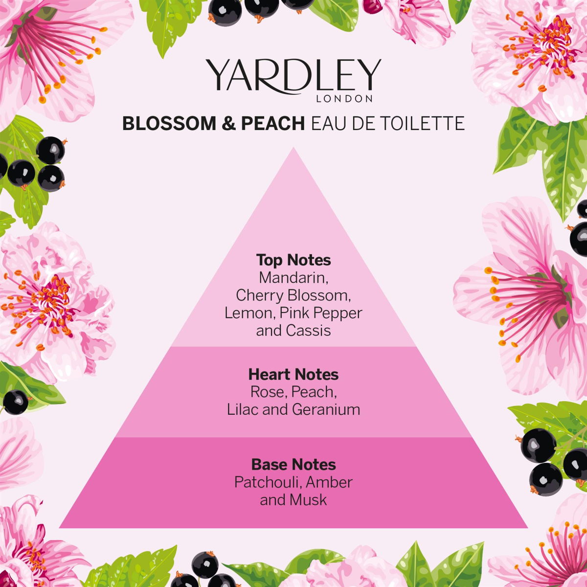 Yardley London's Blossom & Peach is a fruity, spicy floral fragrance blending citrus and cassis with cherry blossom and pink pepper and a floral heart of rose, peach, lilac and geranium with woody notes, patchouli and musk.