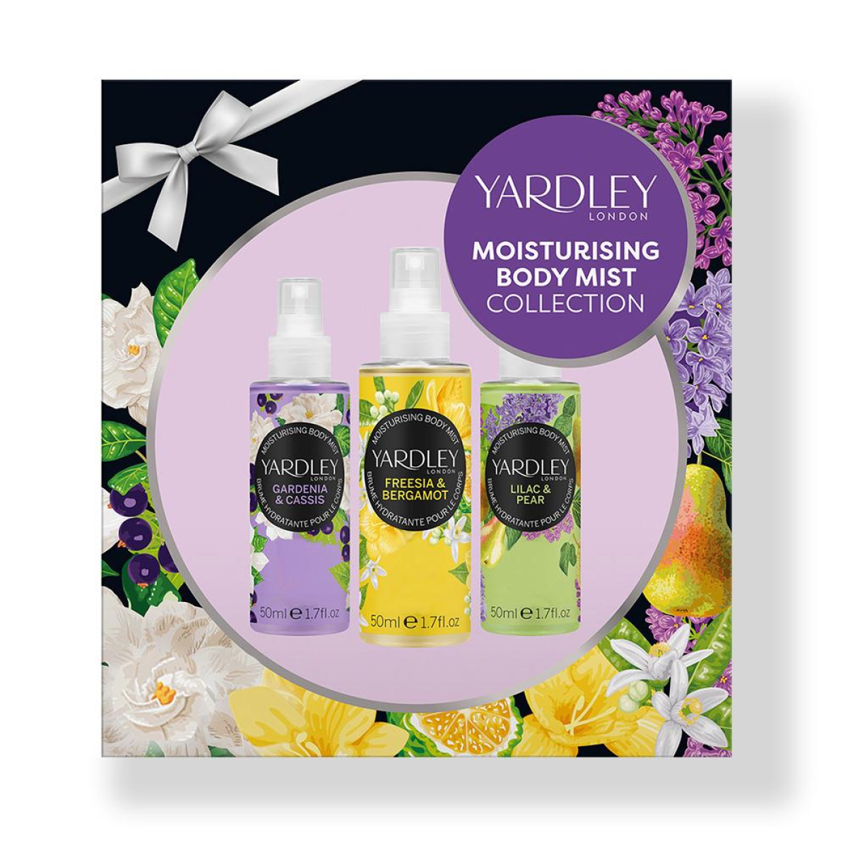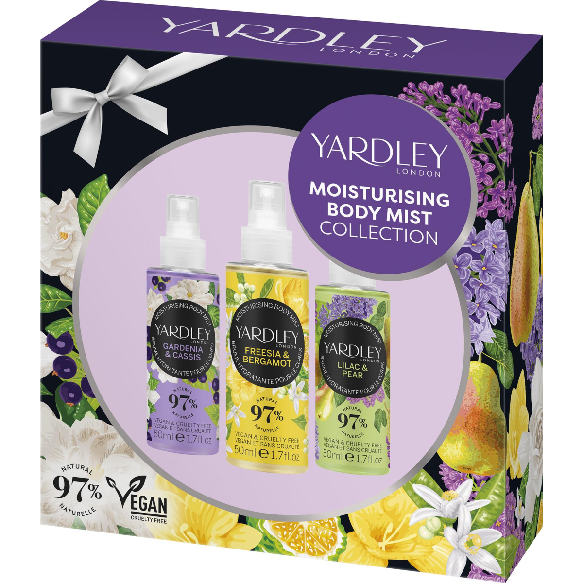 This fragranced gift set for her features a collection of Yardley London's Moisturising Body Mists from the contemporary florals range in Gardenia & Cassis, Freesia & Bergamot, and Lilac & Pear. Ideal for popping into a handbag to freshen up anytime, day or night. Vegan, Cruelty-free, and 97% Natural. Plastic-free gift box.