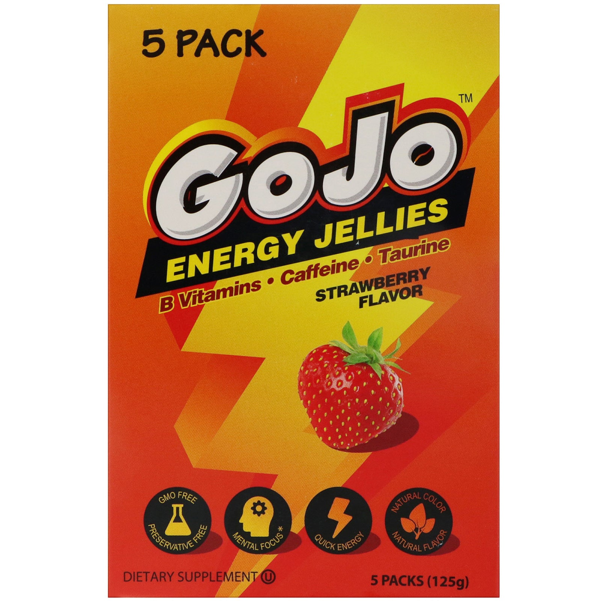B Vitamins Caffeine Taurine GMO Free Preservative Free Mental Focus Quick Energy Natural Color Natural Flavor Dietary Supplement Kosher Vitamin B help breakdown and process foods to create energy for the body. Caffeine stimulates the nervous system to keep you focused and alert. Taurine an amino acid that is essential for cardiovascular function, supports neurological development and helps regulate the level of water and minerals in the blood. Guarana Extract a natural stimulant containing caffeine, guarana reduces your mental and physical fatigue to keep you going. GoJo's great tasting jellies contain an energy blend that includes caffeine, taurine and B vitamins to provide energy and help mental focus. Nut free Gluten free GMO free Vegan