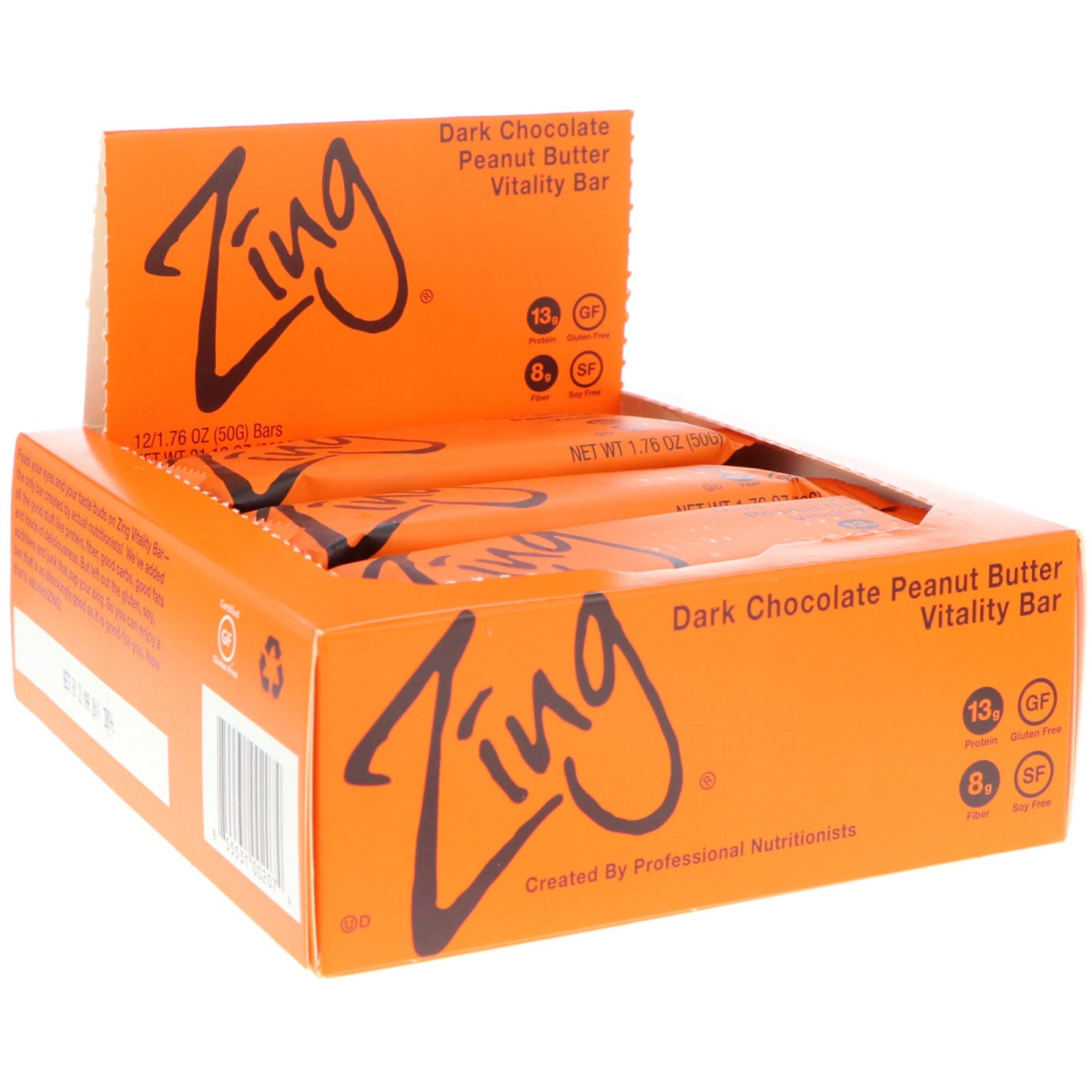 Created by Professional Nutritionists 13 g Protein Certified Gluten Free 8 g Fiber Soy Free Kosher Feast your eyes and your taste buds on Zing Vitality Bar - the only bar created by actual nutritionists! We've added all the good stuff like protein, fiber, good carbs, good fasts and loads of deliciousness. But left out the gluten, soy, additives and junk that zap your zing. So you can enjoy a bar that is as shockingly good as it is good-for-you. Now that's astonishZING!
