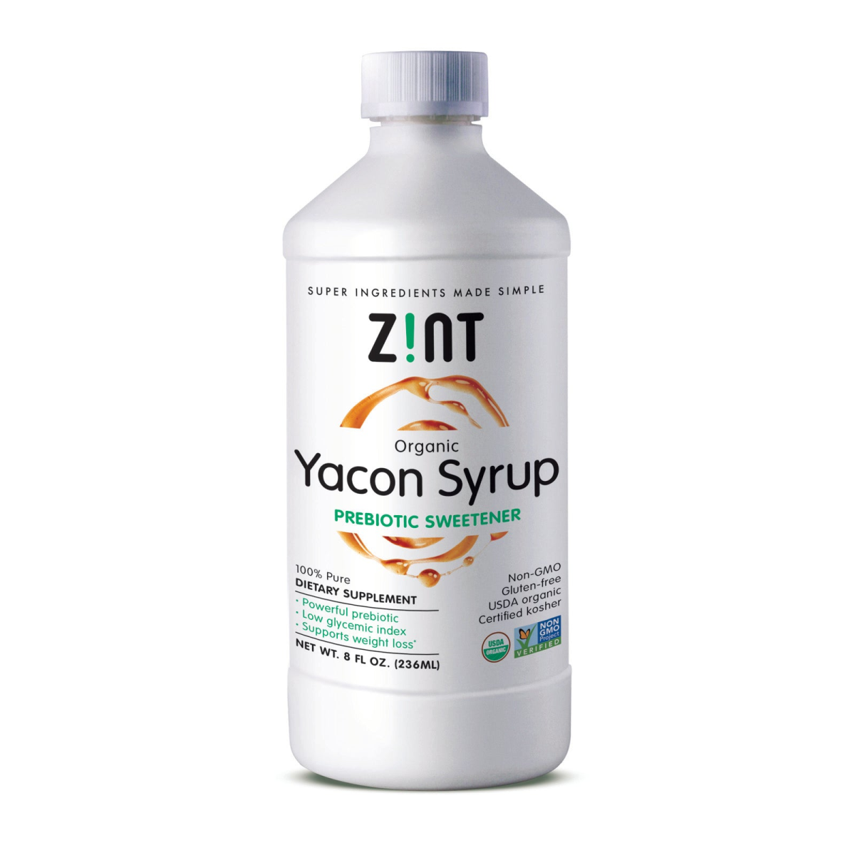 Super Ingredients Made Simple Prebiotic Sweetener 100% Pure Dietary Supplement Powerful Prebiotic Low Glycemic Index Supports Weight Loss Non-GMO Project Verified Gluten-Free USDA Certified Kosher The Apple of the Earth Who says eating healthy can't be delightful? The yacon root offers a low glycemic index, low calories, and active weight-loss benefits. Its secret lies in a hard-to-pronounce ingredient called fructooligosaccharide (FOS). As a powerful prebiotic, FOS reaches the colon unmetabolized and nourishes the good bacteria in your system. In turn, a healthy gut microbiome has profound benefits on your health, waistline and emotional wellbeing. The Zint Difference: The sunny yellow flowers of our yacon plants can be found blooming in ideal conditions on family-owned farms on the northern coast of Peru. Once pressed, the fresh juice is heat-reduced to a dark, nutrient-rich, honey-like syrup that concentrates yacon's many health benefits.