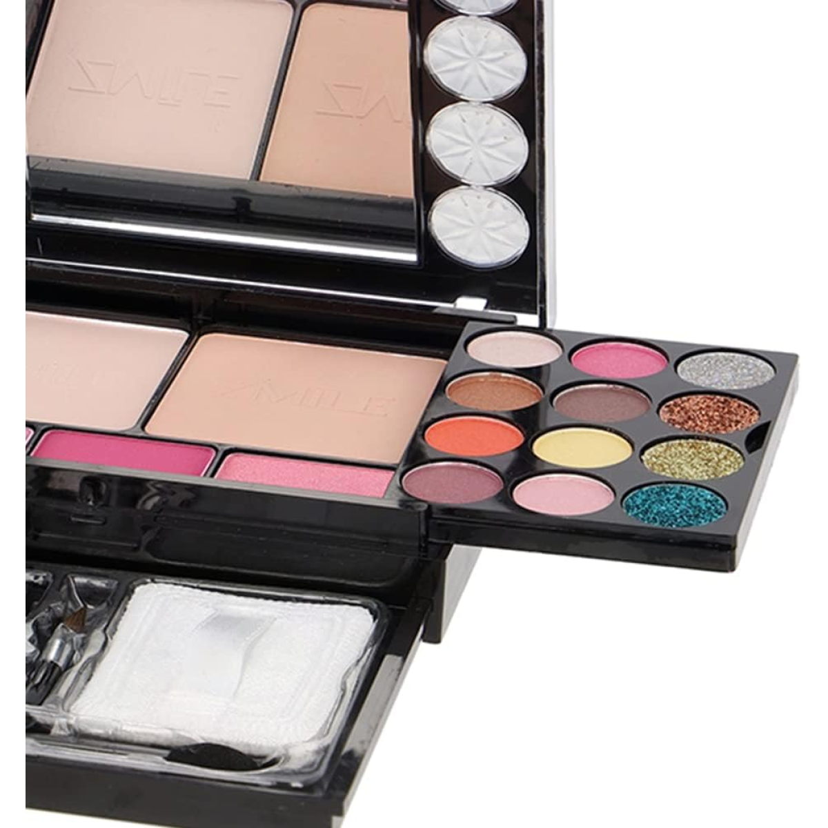- FILLED TO THE BRIM: The extensive make-up set with a mirrored, black lid includes eye shadow, lip gloss cream, body glitter cream, blush, face powder, powder puff and brush and applicator set as well as an integrated mirror
